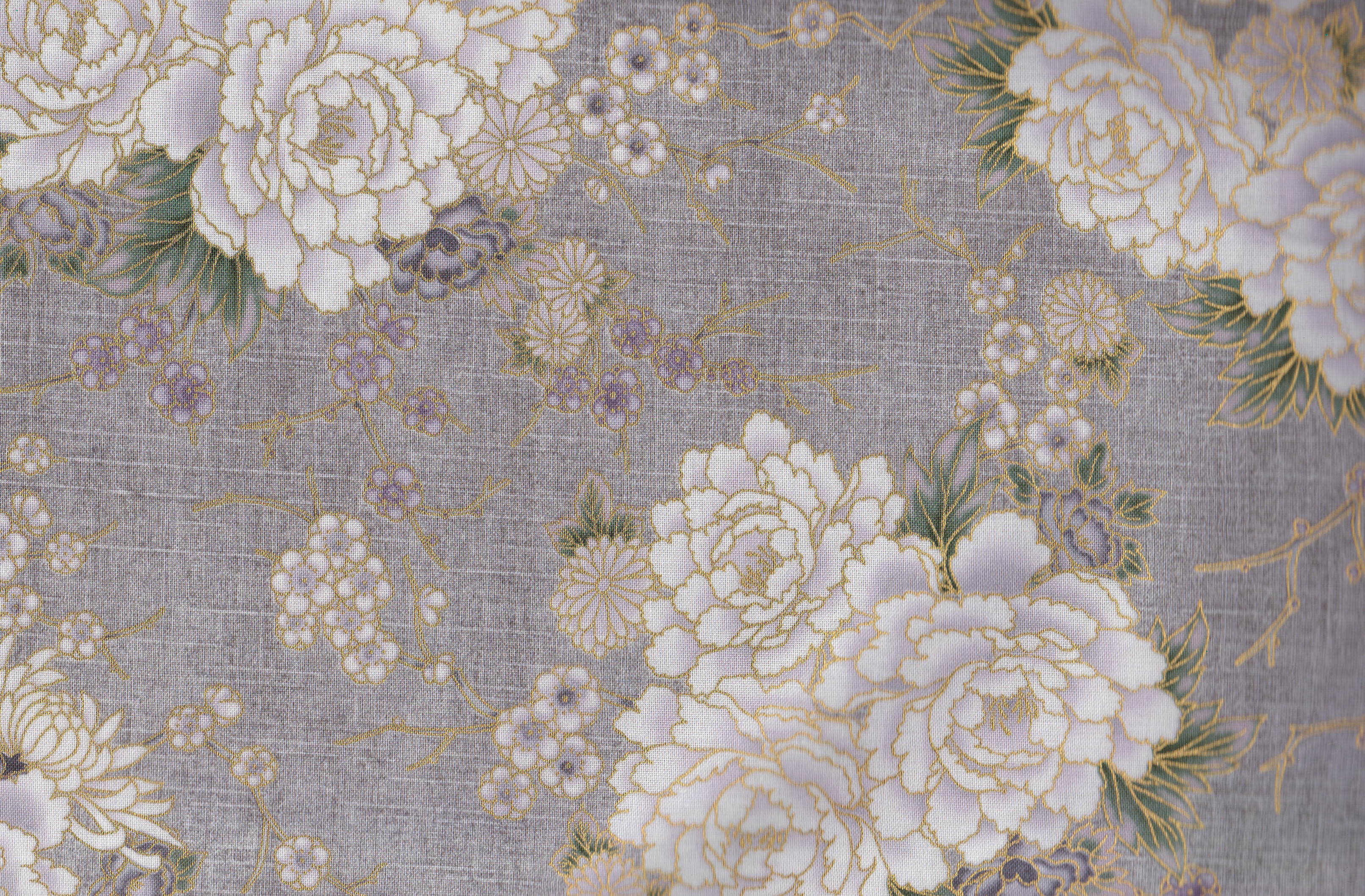 Patchworkstoff in Grau mit Blumen und mit Golddruck.
