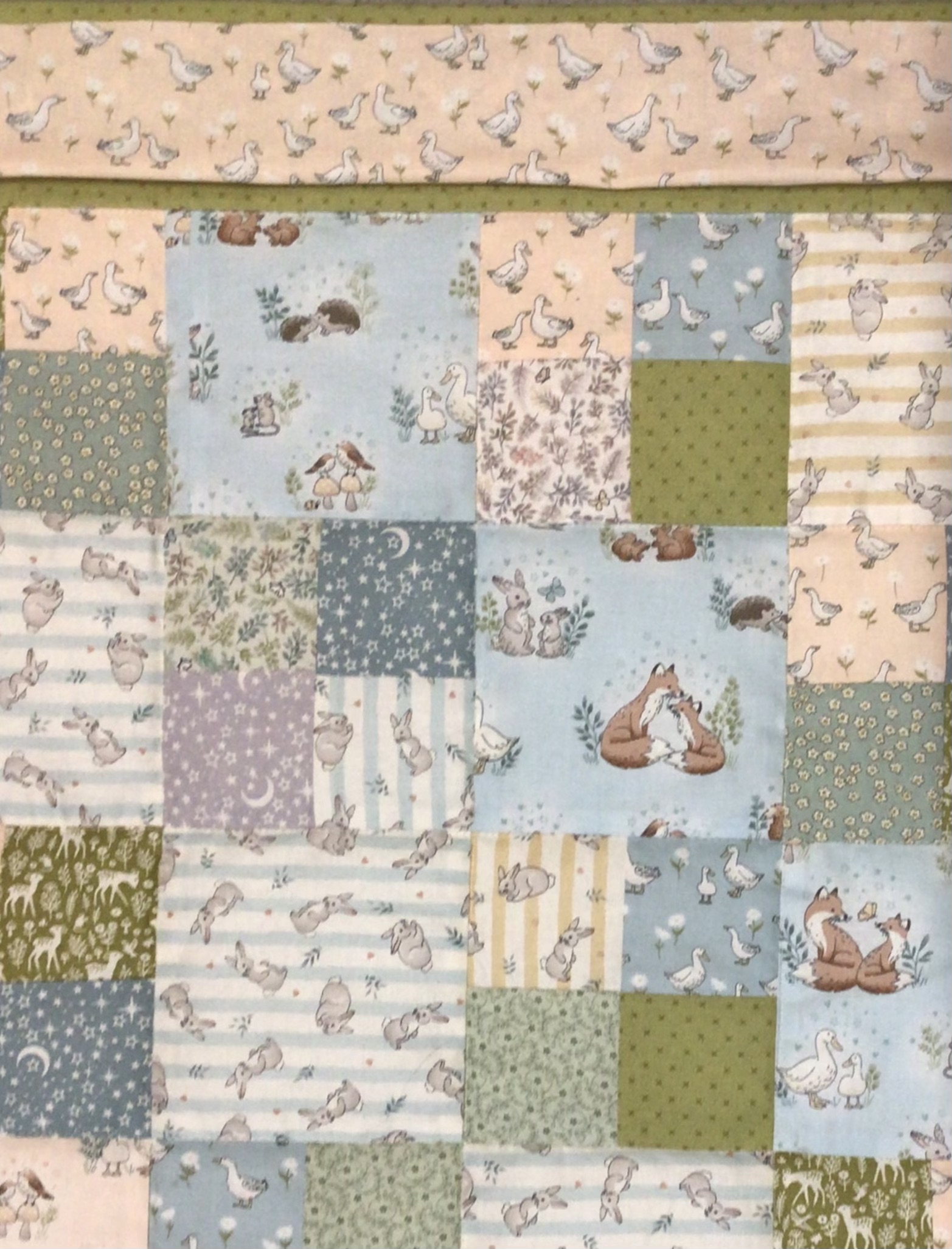 Diese Decke ist zügig zu fertigen. Auch für Anfänger geeignet. Die Materialpackung enthält alle Stoffe fürs Top und Binding, Rückseite mit Flannelstoff oder Nikistoff in Mint. Vlies Pöliester 285, noch dieckere Poli 199, oder Baumwolle 277. Eine ausführliche Anleitung ist beigefügt.Bitte die Vliesauswahl und Rückseite im Kommentar schreiben.