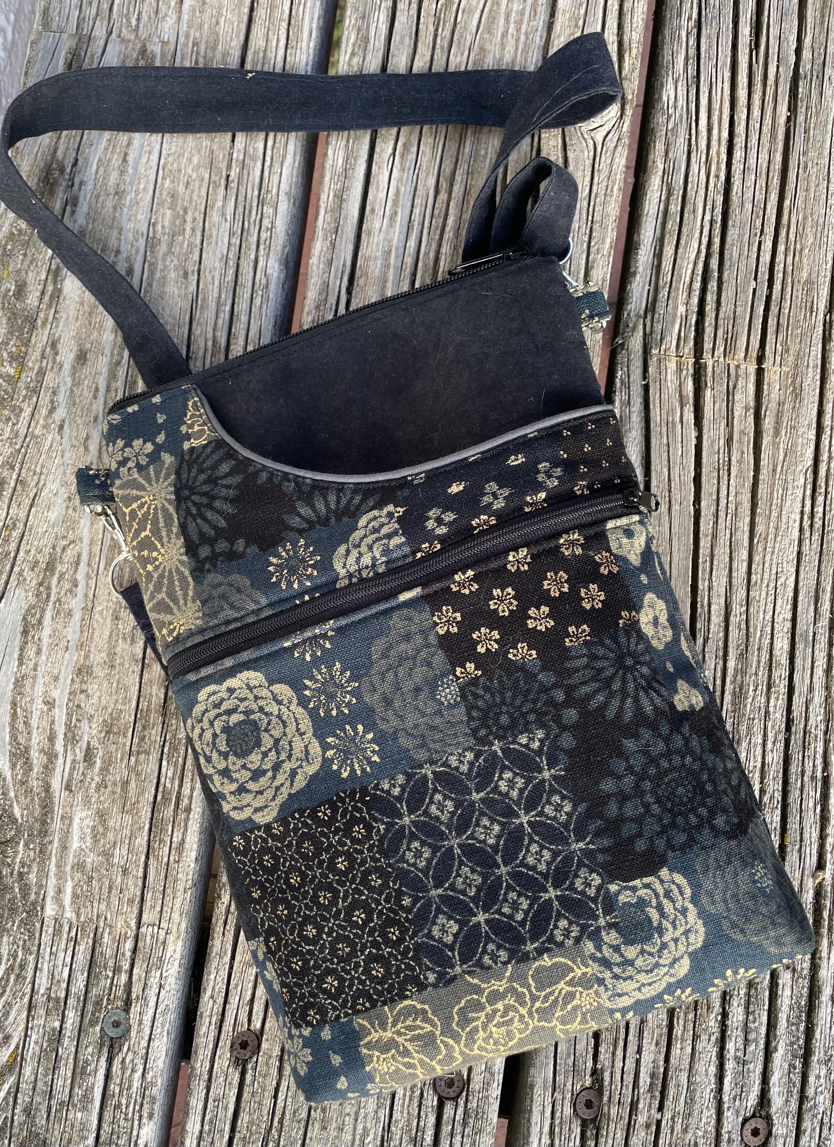 Materialpackung für die kleine Tasche" Paulinchen" 29 x 22 x 3,5 cm mit drei Außentaschen enthält eine detaillierte Anleitung mit Schnitt in Originalgröße, alle Stoffe ( Japanische Muster), Paspel, Vlies, Reißverschlüsse, D-Ringe, Karabinerhaken, Verstellschnale und Gurt.