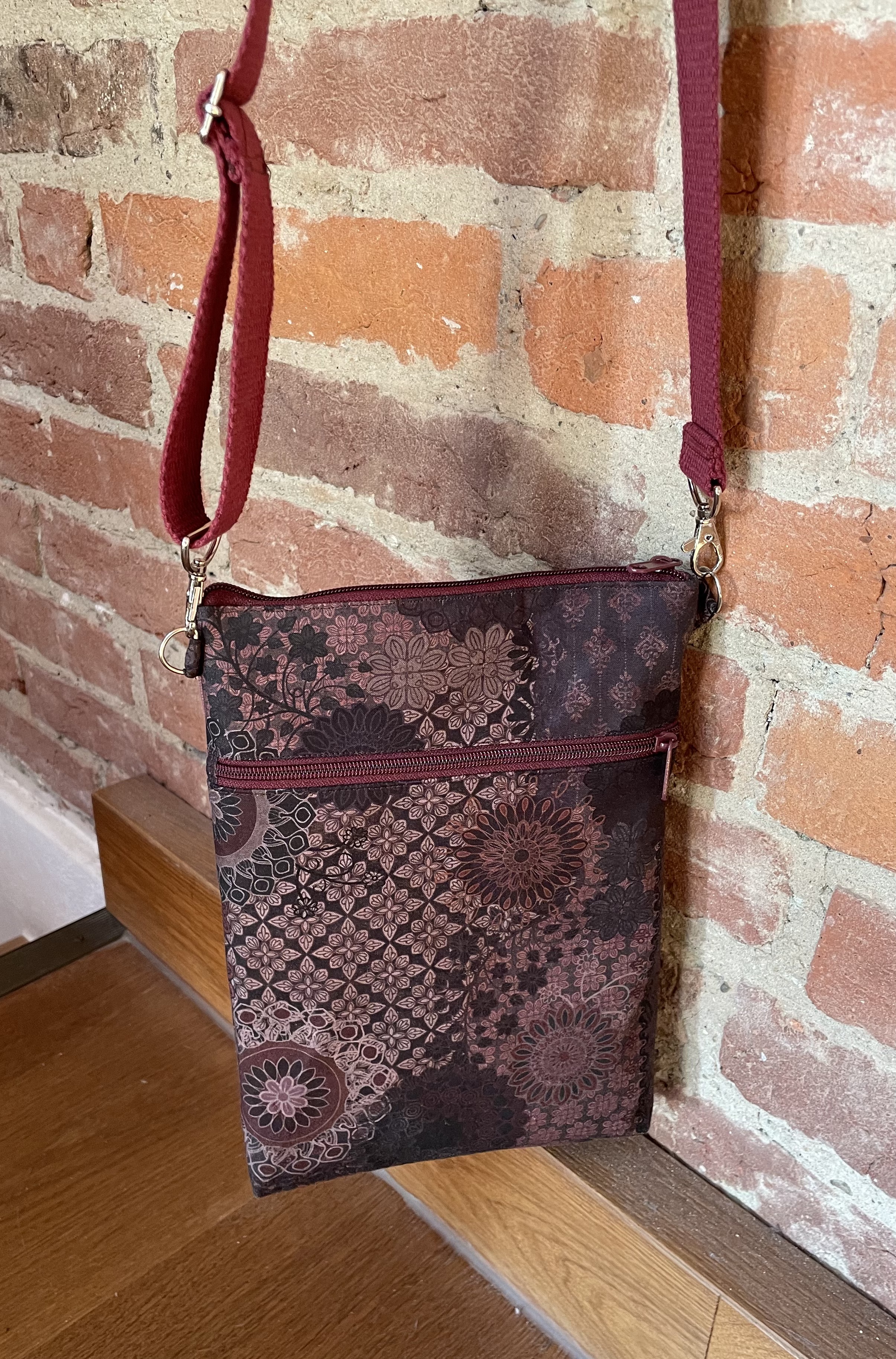 Materialpackung für die kleine Tasche" Paulinchen" 29 x 22 x 3,5 cm mit drei Außentaschen enthält eine detaillierte Anleitung mit Schnitt in Originalgröße, alle Stoffe, Paspel,Vlies, Reißverschlüsse, Vlies, D-Ringe, Karabinerhaken.Kunstleder für Gurt.