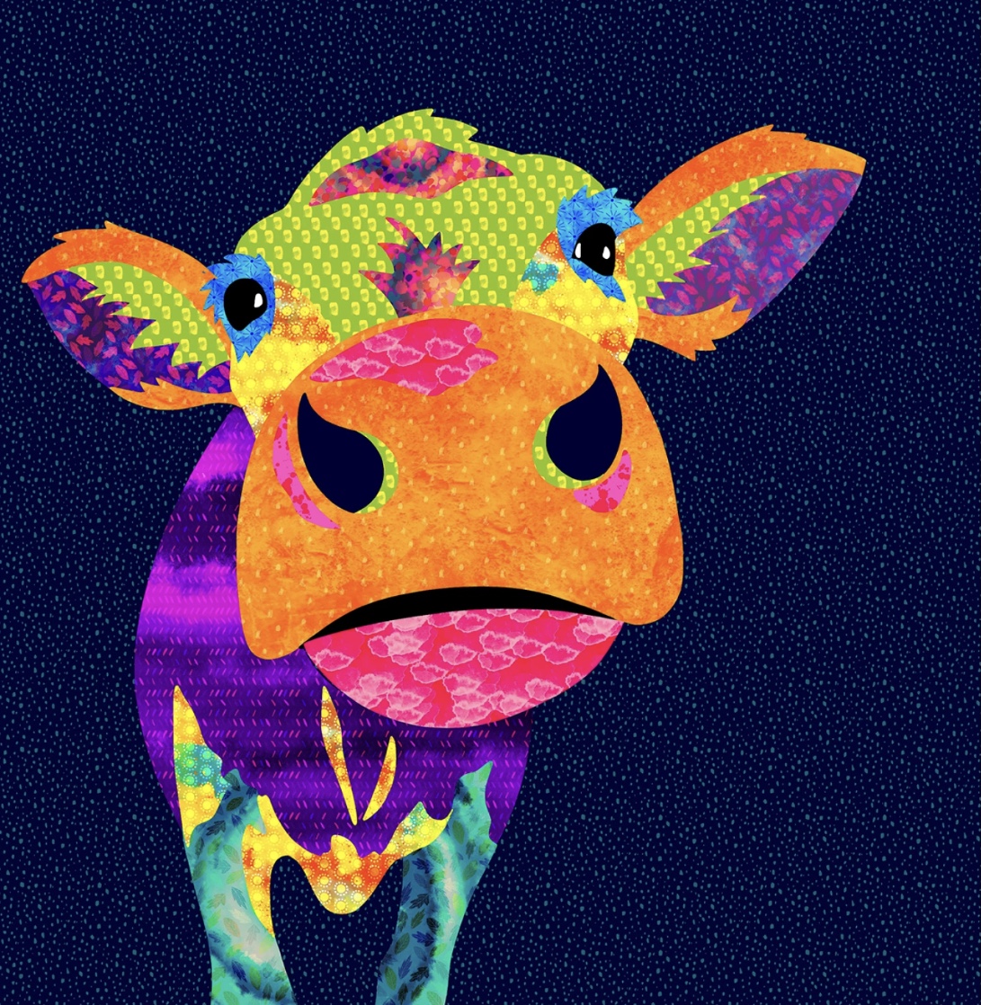 Patchworkstoff / Panel mit gezeichnete Kuh als Motiv und mit bunten Stoffen fürs Kuh Motiv. Beschreibung ist auf englisch. Sie brauchen dazu doppelt seitiger Klebeeinlage: Vlisofix ca. 45 cm. Fertig Größe des Bildes ist ca.50 x 50 cm.