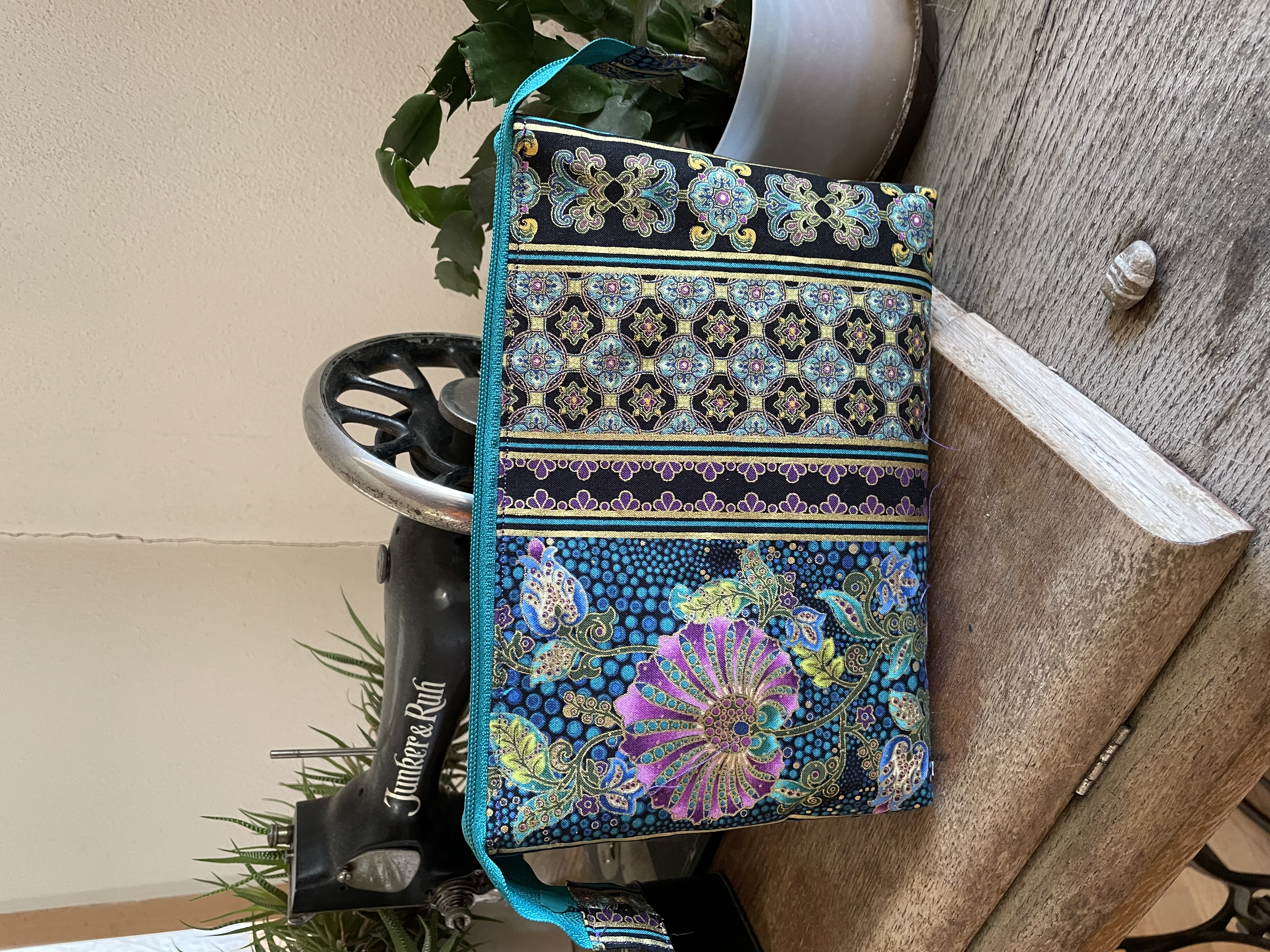 Die Materialpackung für 1 Täschchen enthält alle Bordürenstoff, Futterstoff in Lila, Reißverschluss, Vlies, Futterstoff und eine detaillierte Anleitung mit Fotos. Das Täschchen hat drei Fächer. Nicht für Anfänger geeignet.