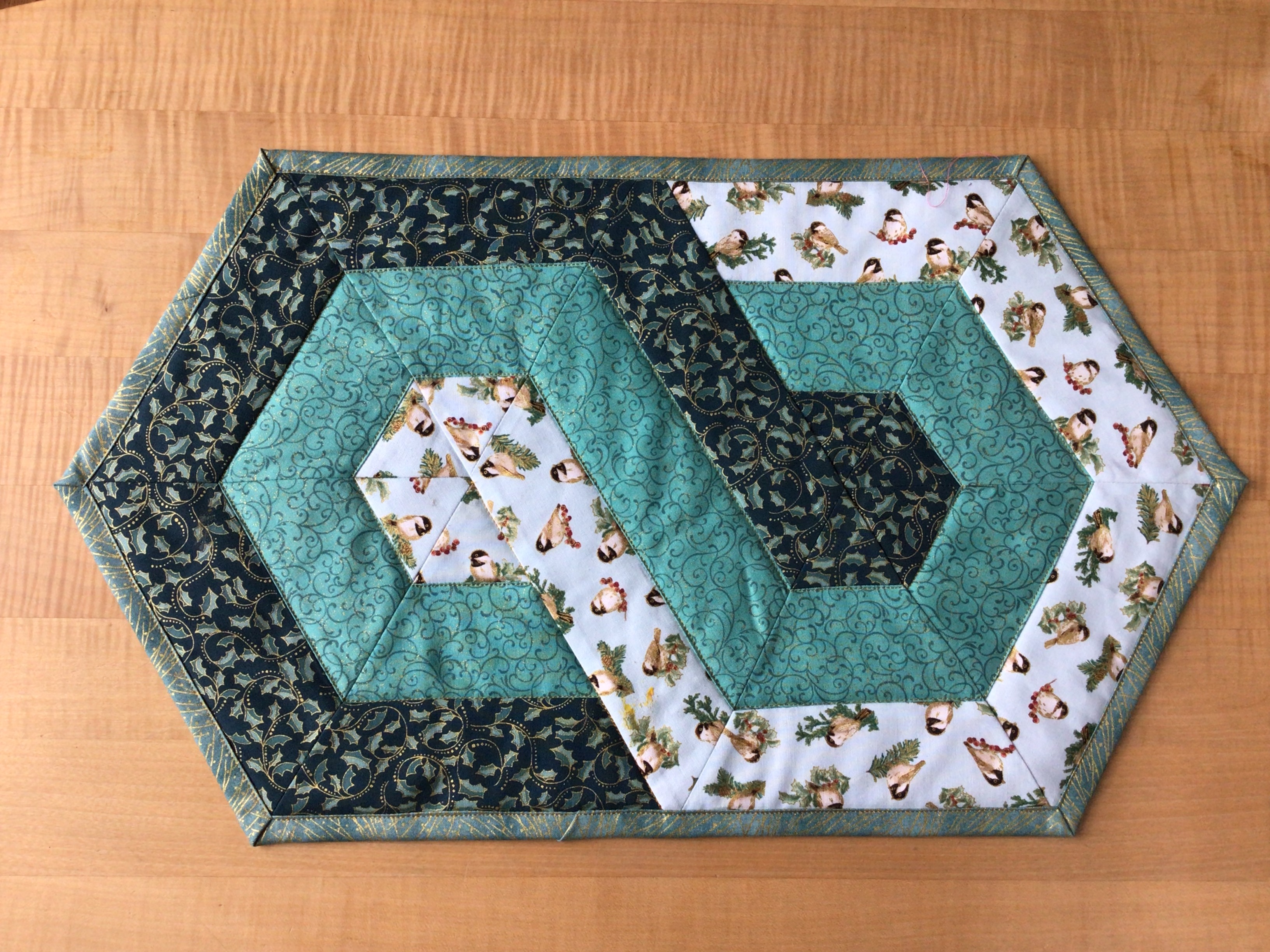 Anleitung für kleine Deckchen in Größe 33 x 56. Material: 3 Stoffe je 15 x 110 cm, Einfassung 10 x 110 cm, Vlies und Rückseite.