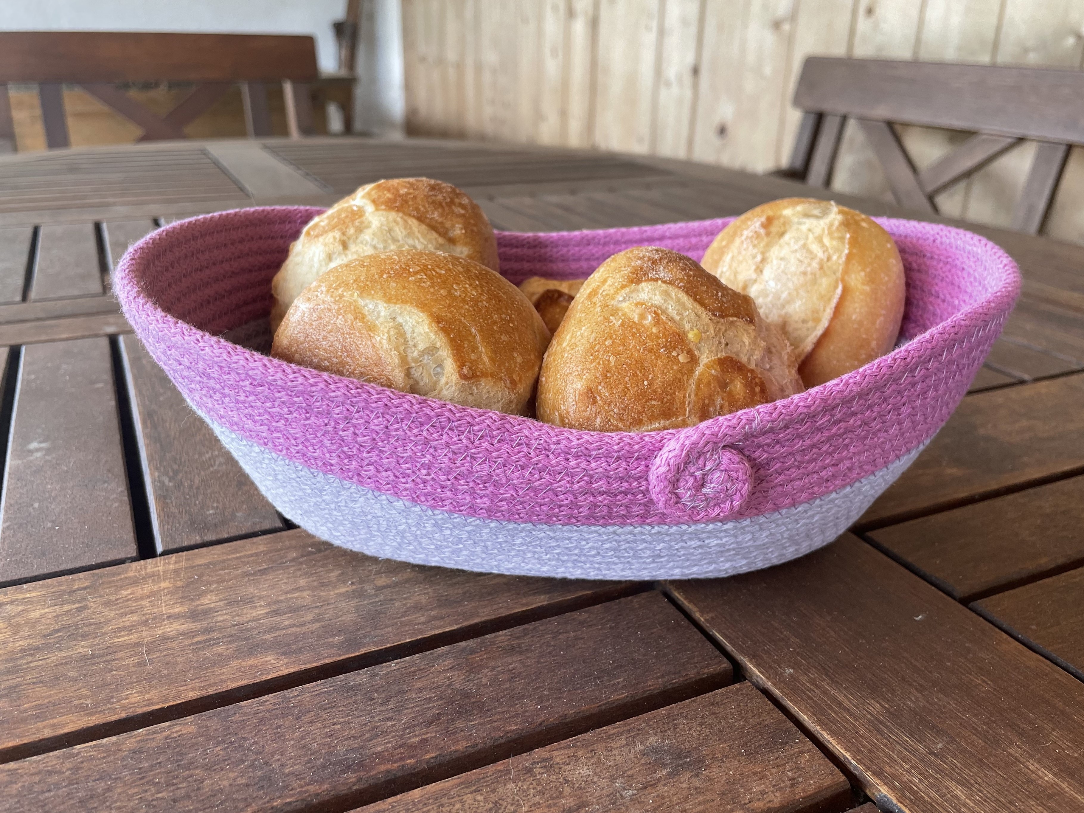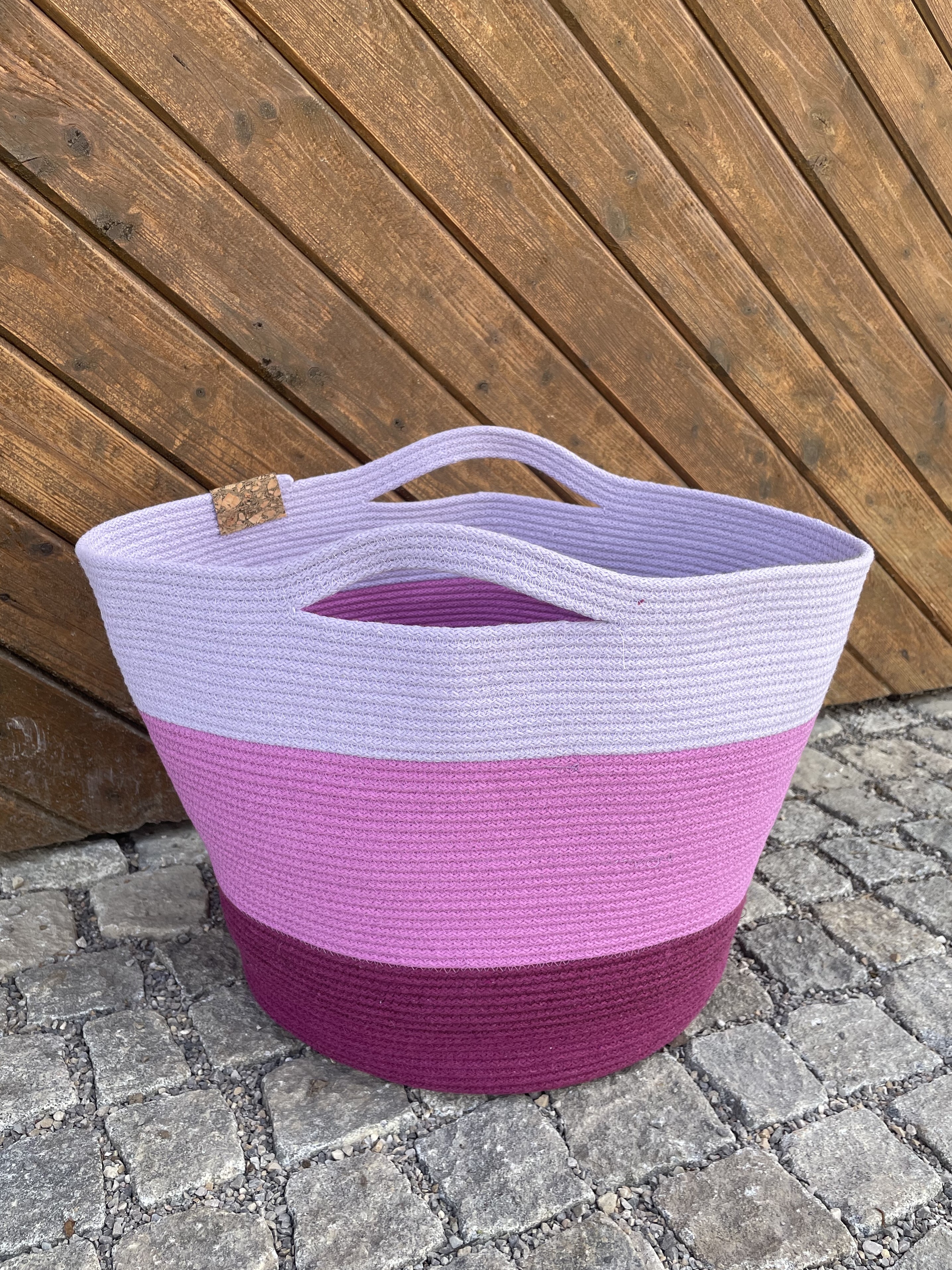 Kordelset mit 3 Farben in Lavendel, Fuchsia, Bordeaux insgesamt 75 m aus recycelter Baumwolle mit 6 mm Durchmesser und einem Polyester-Kern. Es ist ausreichend für ein Großer Korb. Das Material ist sehr gut geeignet für Körbe in verschiedenen Größen, Untersetzer, Taschen, etc.