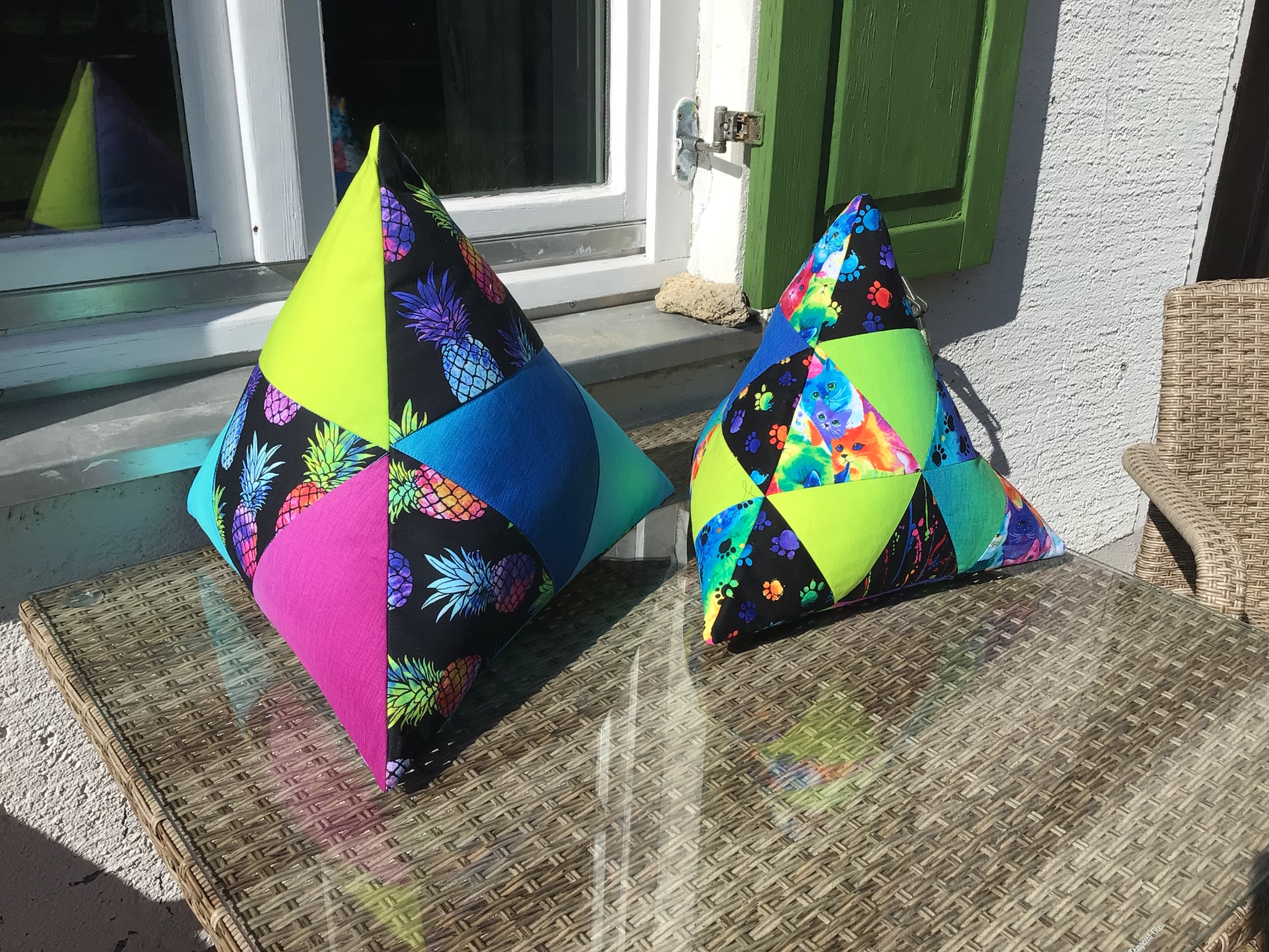 Die Materialpackung für ein Kissen 35 cm hoch enthält: 5 Stoffe für die Dreiecke, Bügelvlies und eine Anleitung. Eine tolle Idee für Kinderzimmer! Nutzlich ist ein langes Lineal mit 60 Grad Aufteilung oder ein Dreiecklineal 60 Grad.