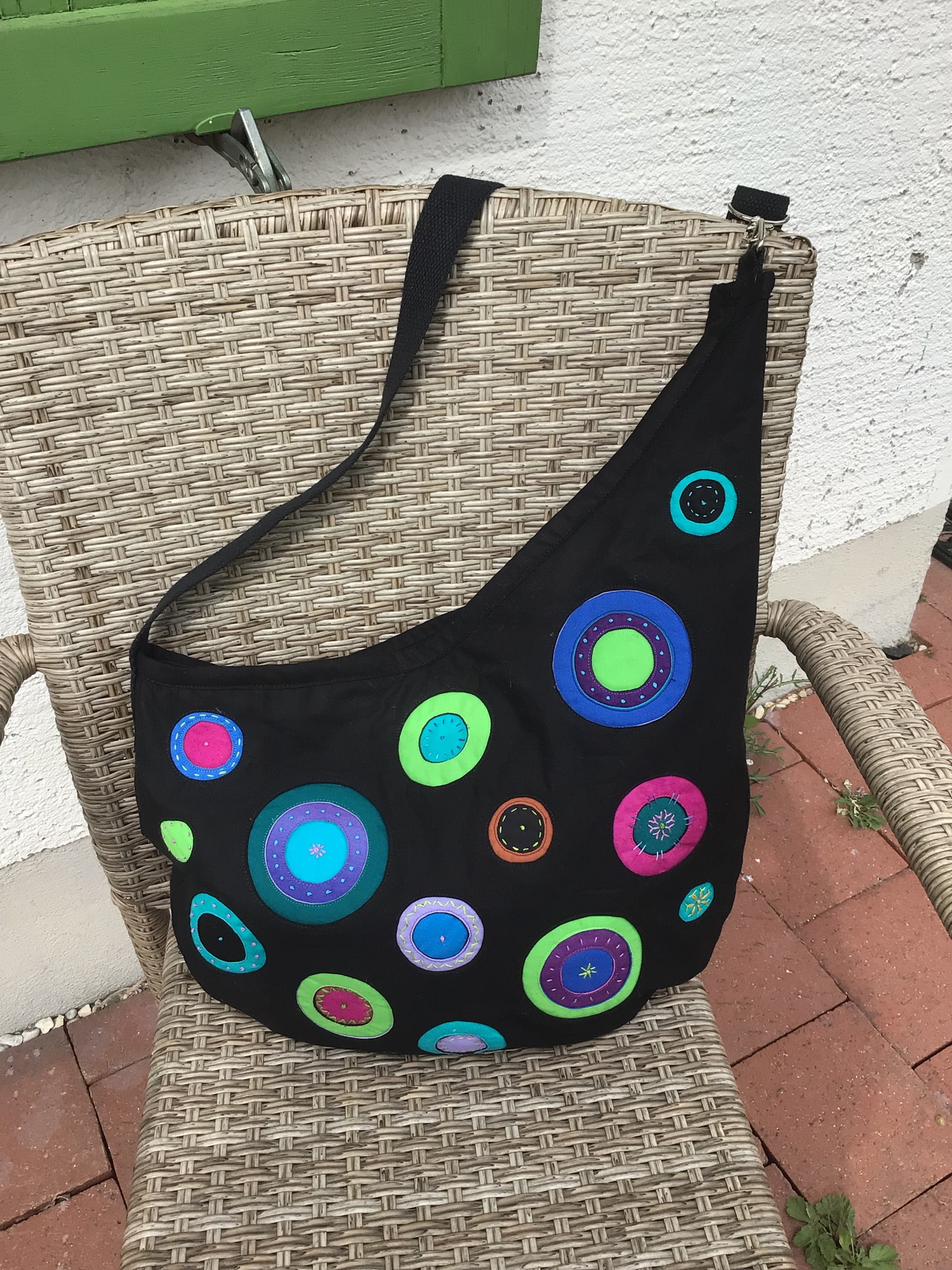 Diese Tasche ist ein Blickfang! Sie braucht etwas Zeit, aber es lohnt sich.Mit vielen Fotos lernen Sie die Technik "Reverse Applique"kennen. Dazu ist die Tasche sehr praktisch und bequem. Materialpackung für eine Tasche enthält Stoffe, Futterstoff, Vlies H 630, Reißverschluss, Gurt, Verstellschnalle, Dreieckring, Karabinerhaken, Stickgarne, detalierte Anleitung mit Schrittfotos und Schnitt in Orginalgröße.