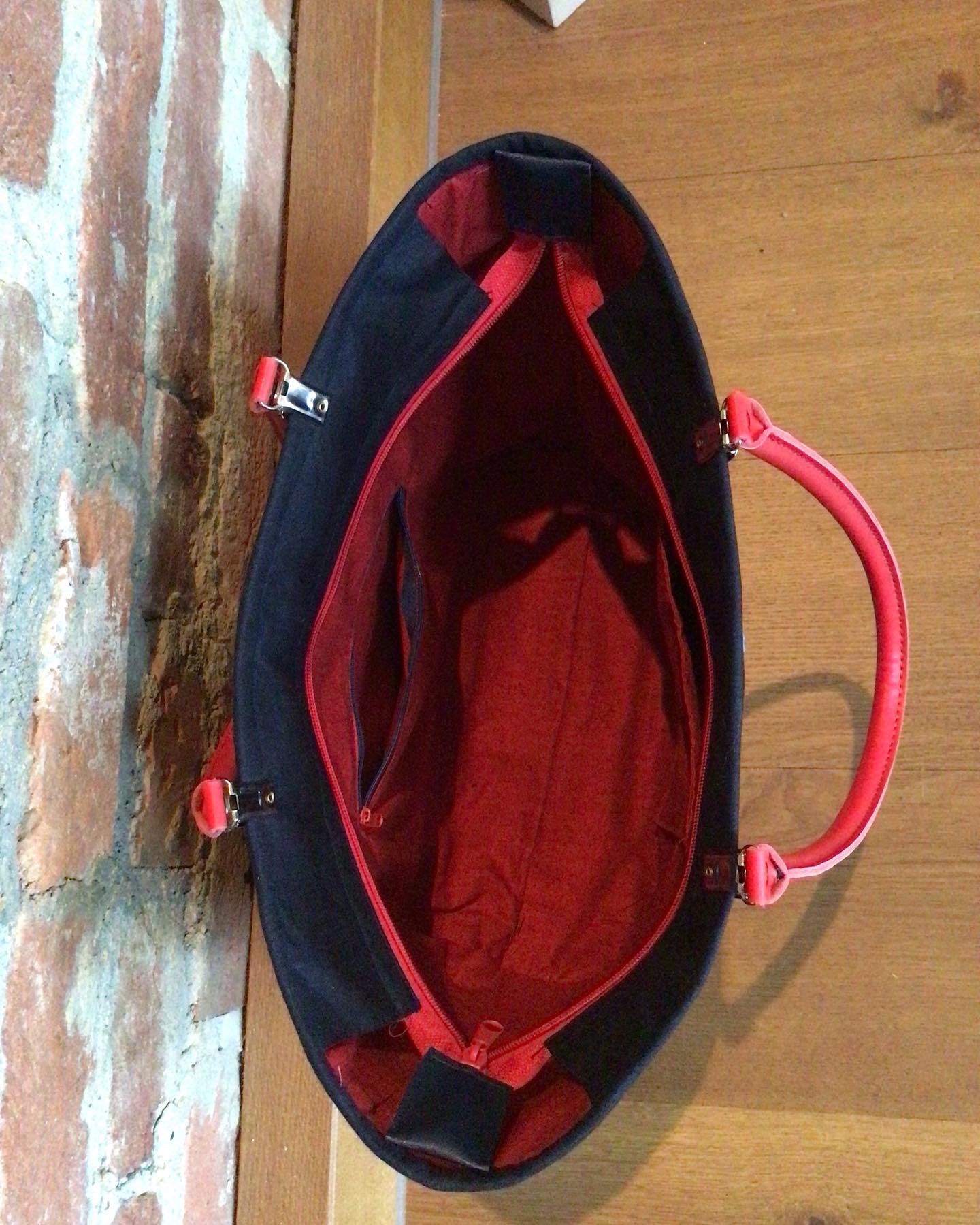 Die Materialpackung für die Tasche "Madame" in der Größe 35 x 45 x 13 cm enthält: Japanische Lecien Stoffe, japanische gewebte Stoffe für die Stege, einen Futterstoff, einen Motivstoff mit Frauenmotiv, Matildas Own Taschenvlies, Reißverschluss, ein Stück Kunstleder für den Boden, Taschenhenkel mit Clips (Kosten: 23.50 €), eine Anleitung und ein Schnitt für den Boden.