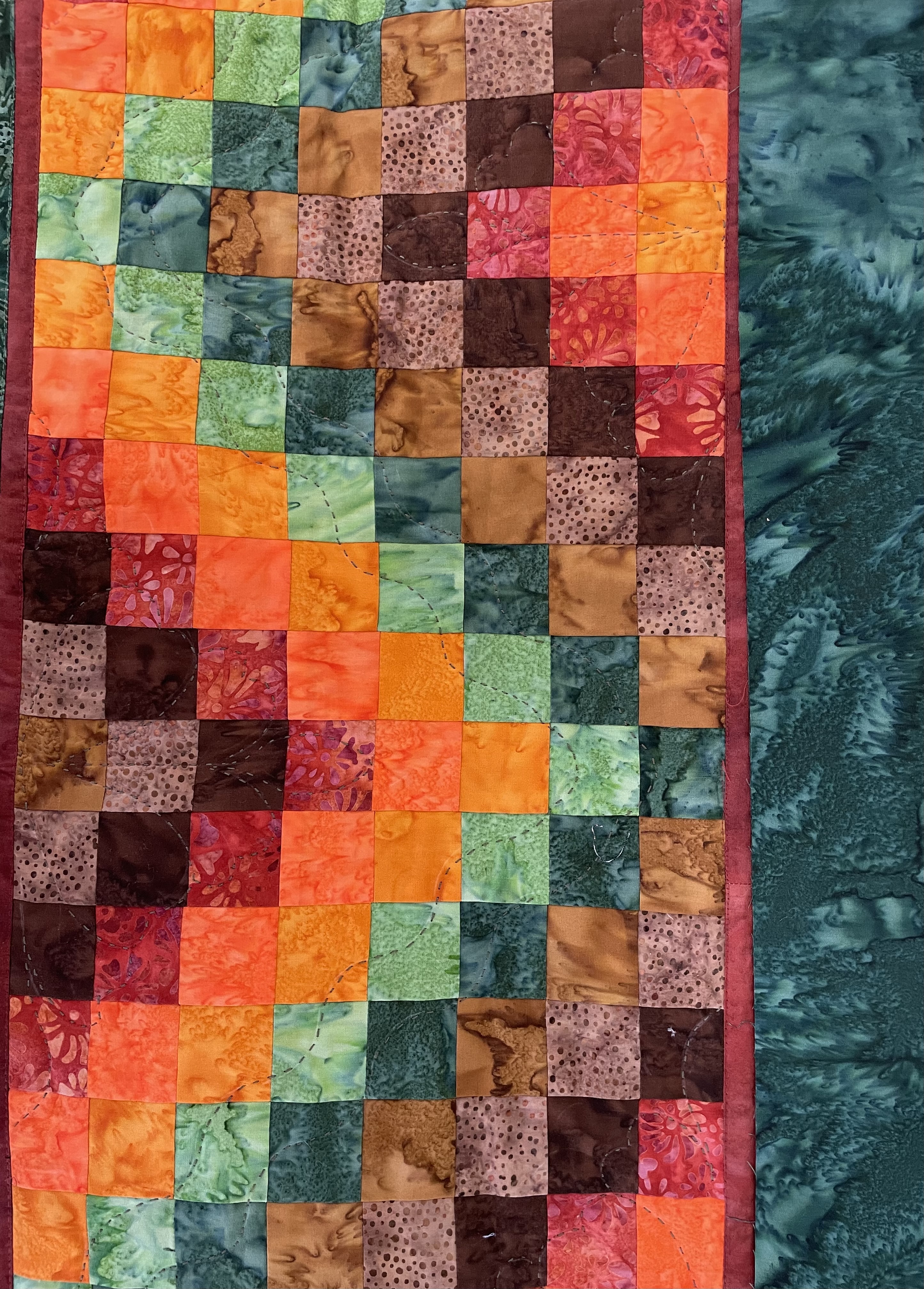 Die Materialpackung beinhaltet den Motivstoff, batik Streifen, Kontraststoff und den Stoff für die Einfassung ,das Vlies Baumwolle von Matildas Own, einen Rückseitenstoff und eine Anleitung. Die Größe des Tischläufers ist 39 x 124 cm. Man kann den Tischläufer eventuell kürzen.