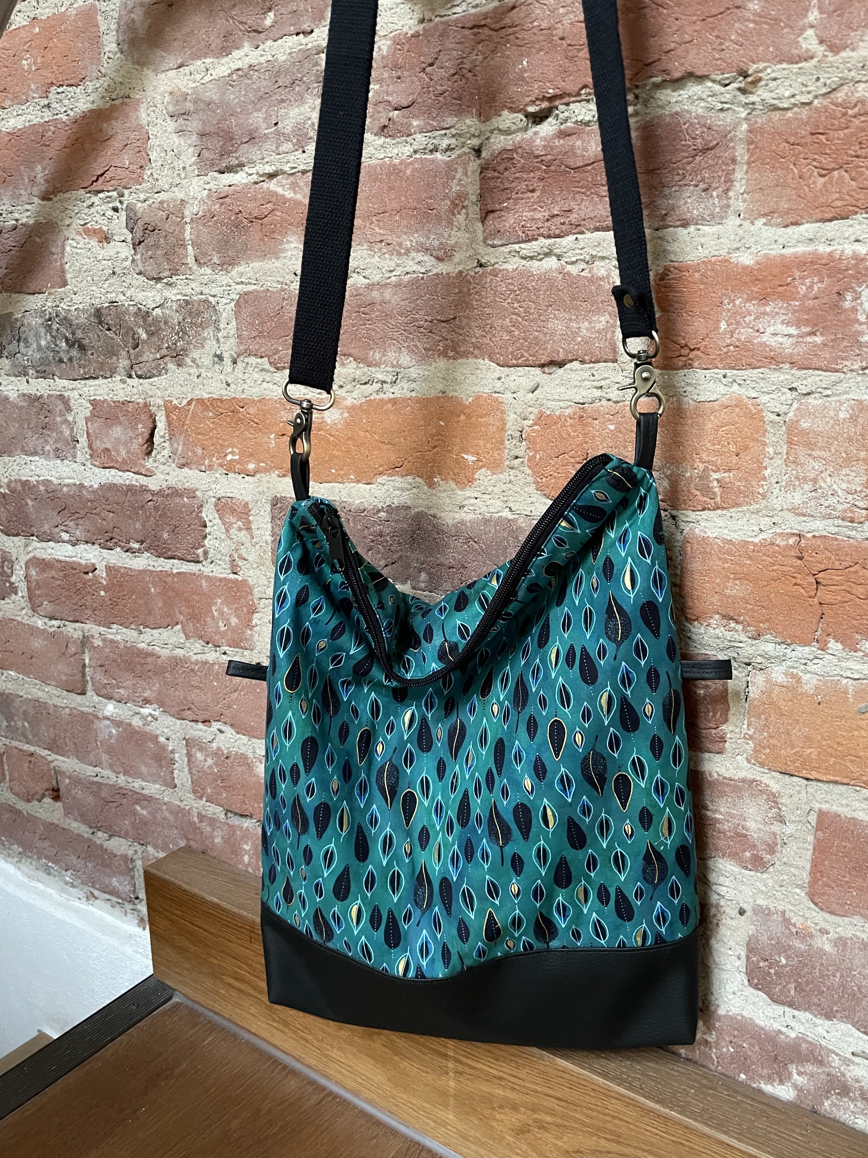 Die Materialpackung für die Tasche Lifestyle Blätter enthält: Stoffe, Kunstleder, Vlies, Gurte, die Karabinerhaken und die Verstellschnalle (oder 2 D-Ringe zum Verstellen), einen Futterstoff, die Reißverschlüsse und eine detaillierte Anleitung.
