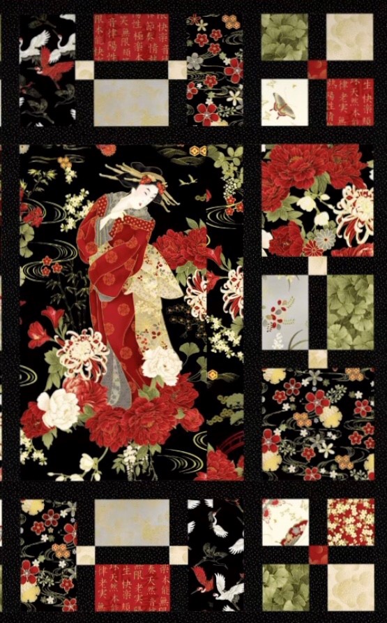 42 Quadrate in der Größe 10 inch (ca. 25,4 cm) sind aus der Serie Kyoto Garden von Timeless Treasures. Japanische Muster mit Goldlinien veredelt. Je Muster3-4 Quadrate.