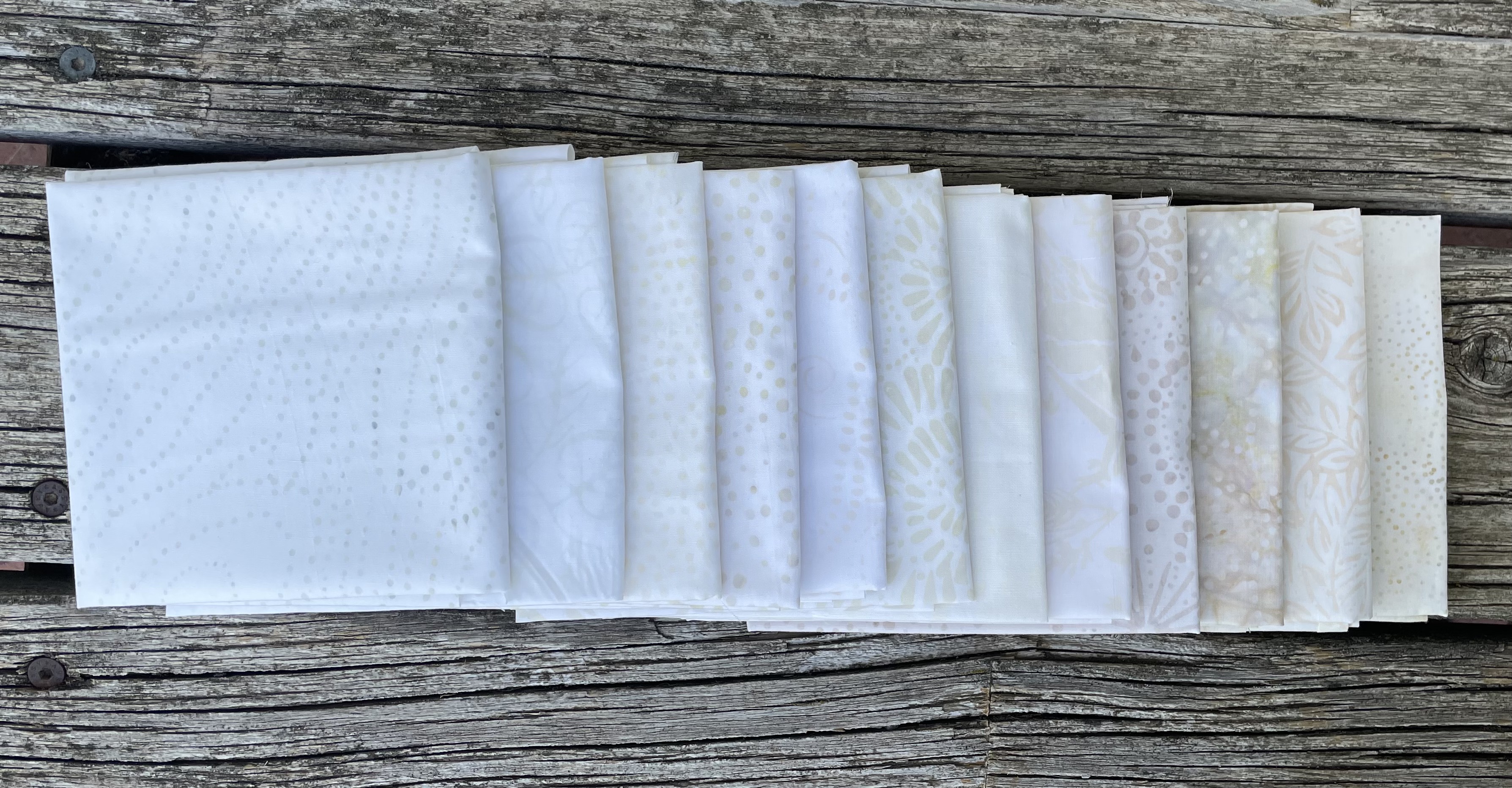 FQ Päckchen mit 12 FQ a 50 x 55 cm. Batikstoffe mit verschiedenen Muster in Creme.