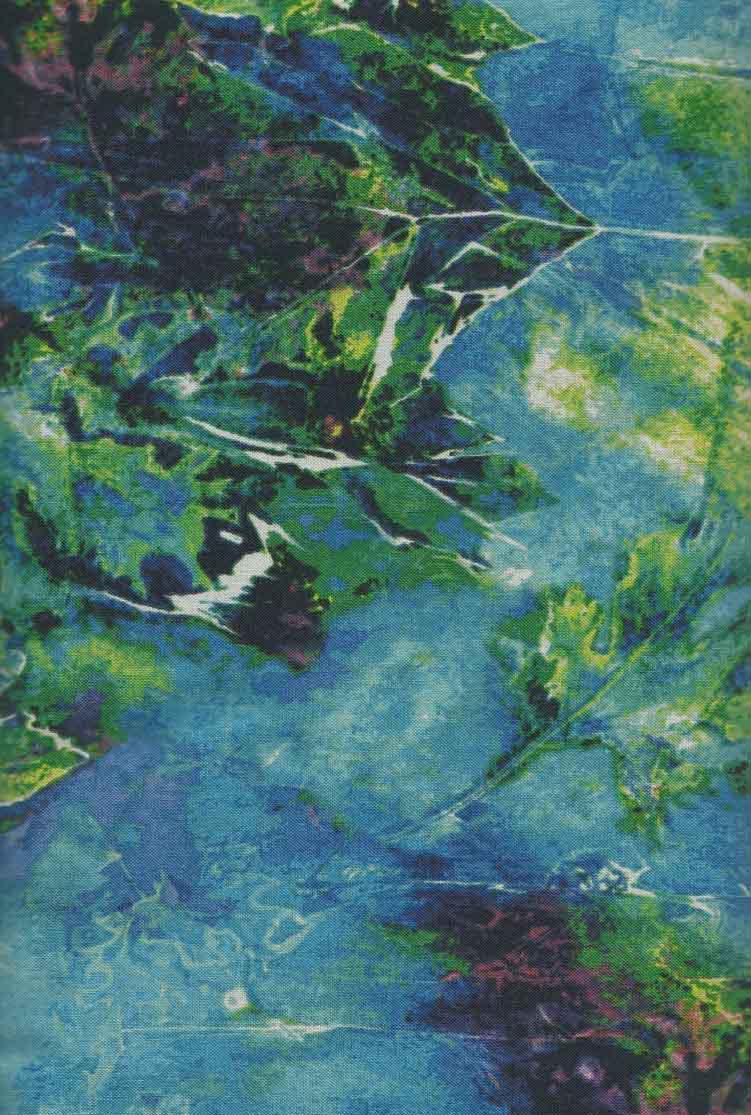 Patchworkstoff in grün-blau stilisiertem abstraktem Blumendruck.