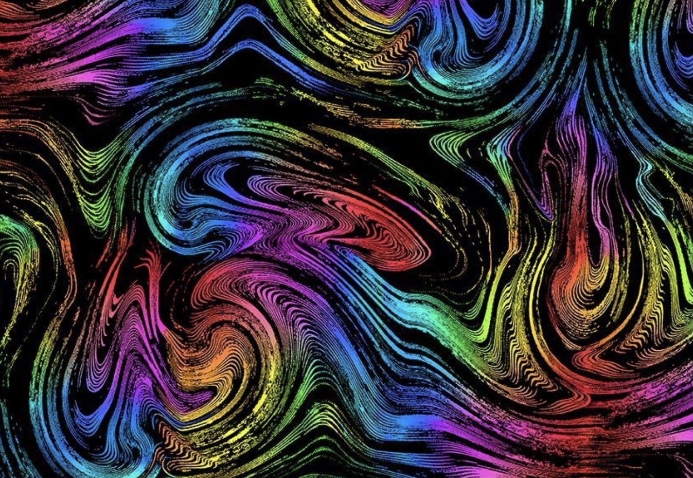 Patchworkstoff in Schwarz mit bunten Streifen ähnlich Papillarlinien. Hochwertiger Digitaldruck.