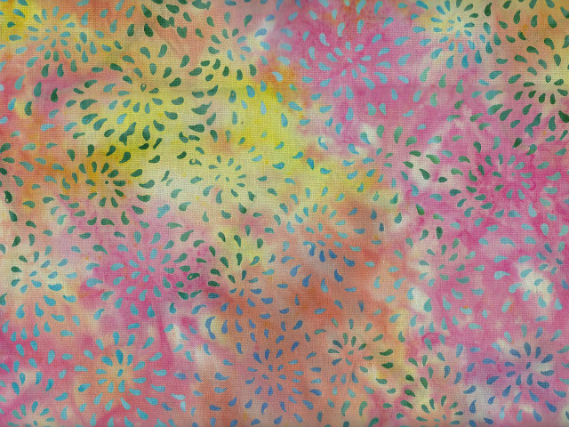 Bali-Batik Stoff in pastelligem Multicolor mit grünem Blumenmuster.