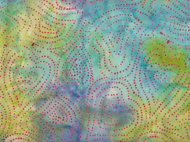 Bali-Batik Stoff in Multicolor mit rotem Herz-Punktemuster.