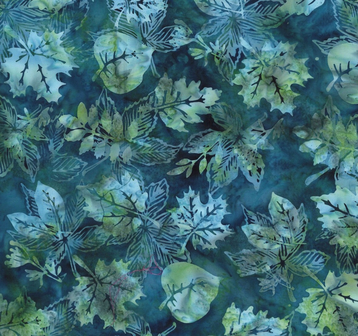Bali-Batik Stoff in Blau-Patrol-Grün mit Blättermuster.