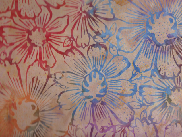Bali Batik-Stoff in Hellbraun mit großen mehrfarbigen Blumen.