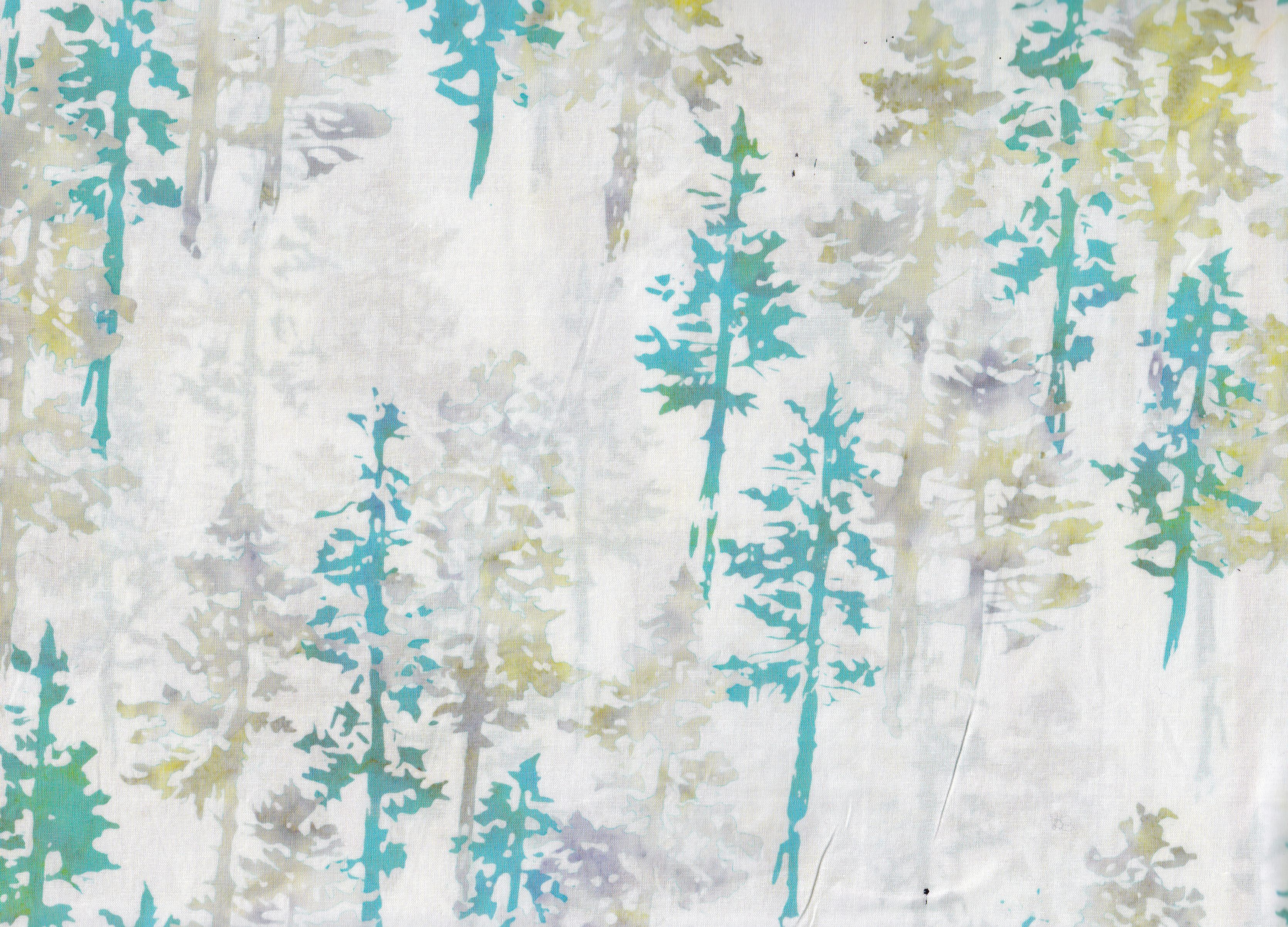 Bali Batik Stoff in Pastelgelb-Weiß mit bäumen in Gelb, Grau Türkis. Design: Mckenna Ryan.