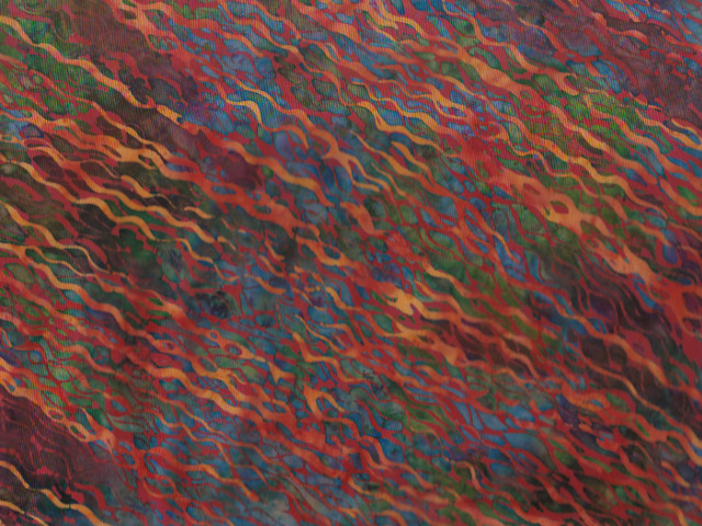 Bali-Batik Stoff mit querliegenden bunten Wellenlinien.