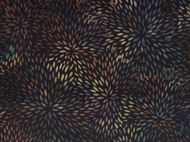 Bali-Batik Stoff in Schwarz mit bunten reisförmigen Punkten.