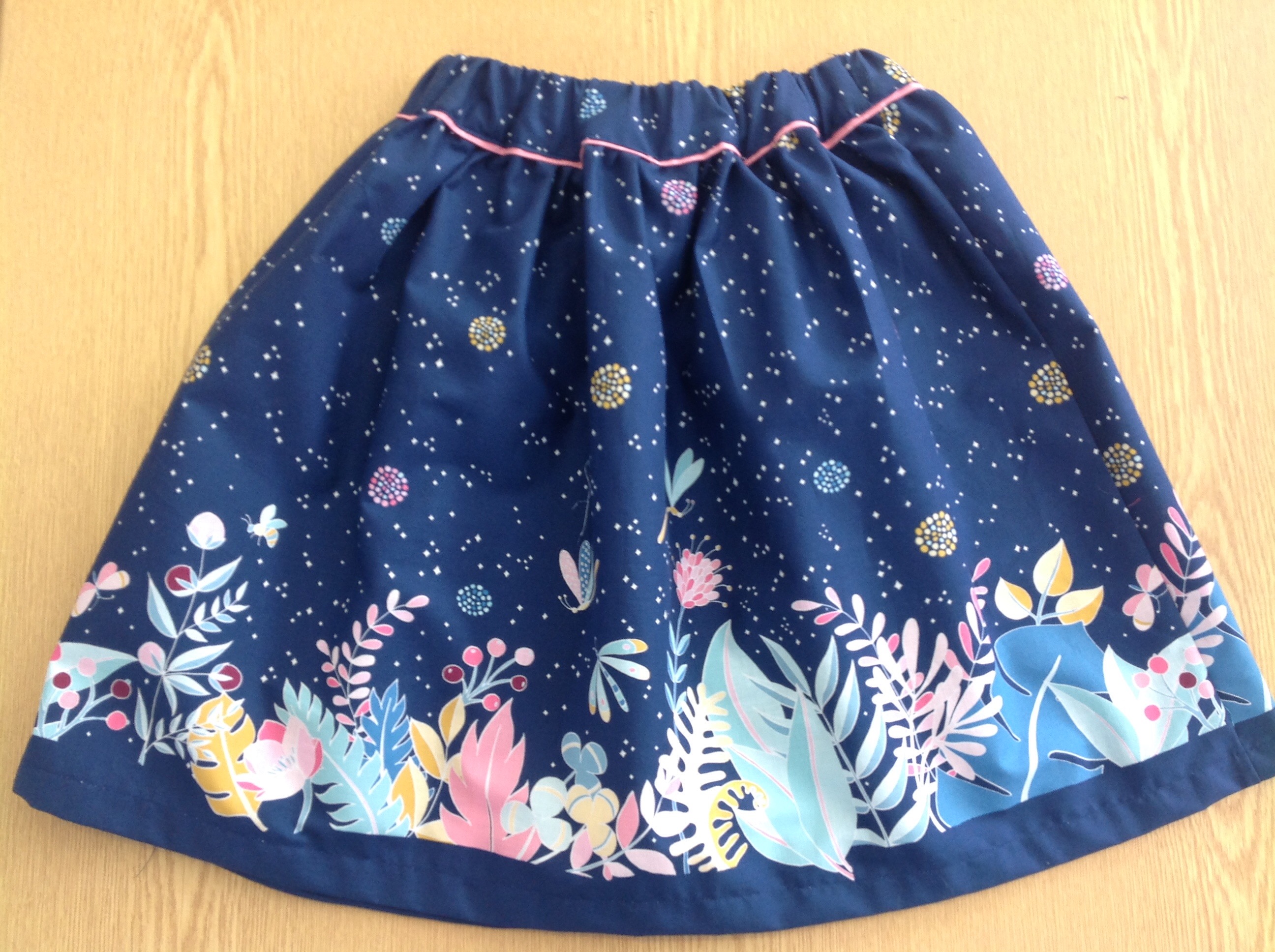 Patchworkstoff in Dunkel Blau. Die Bordüre ist mit bunten Blumen gestaltet. Der Stoff ist auch geeignet für das Nähen von Röcken und Kleidern.
