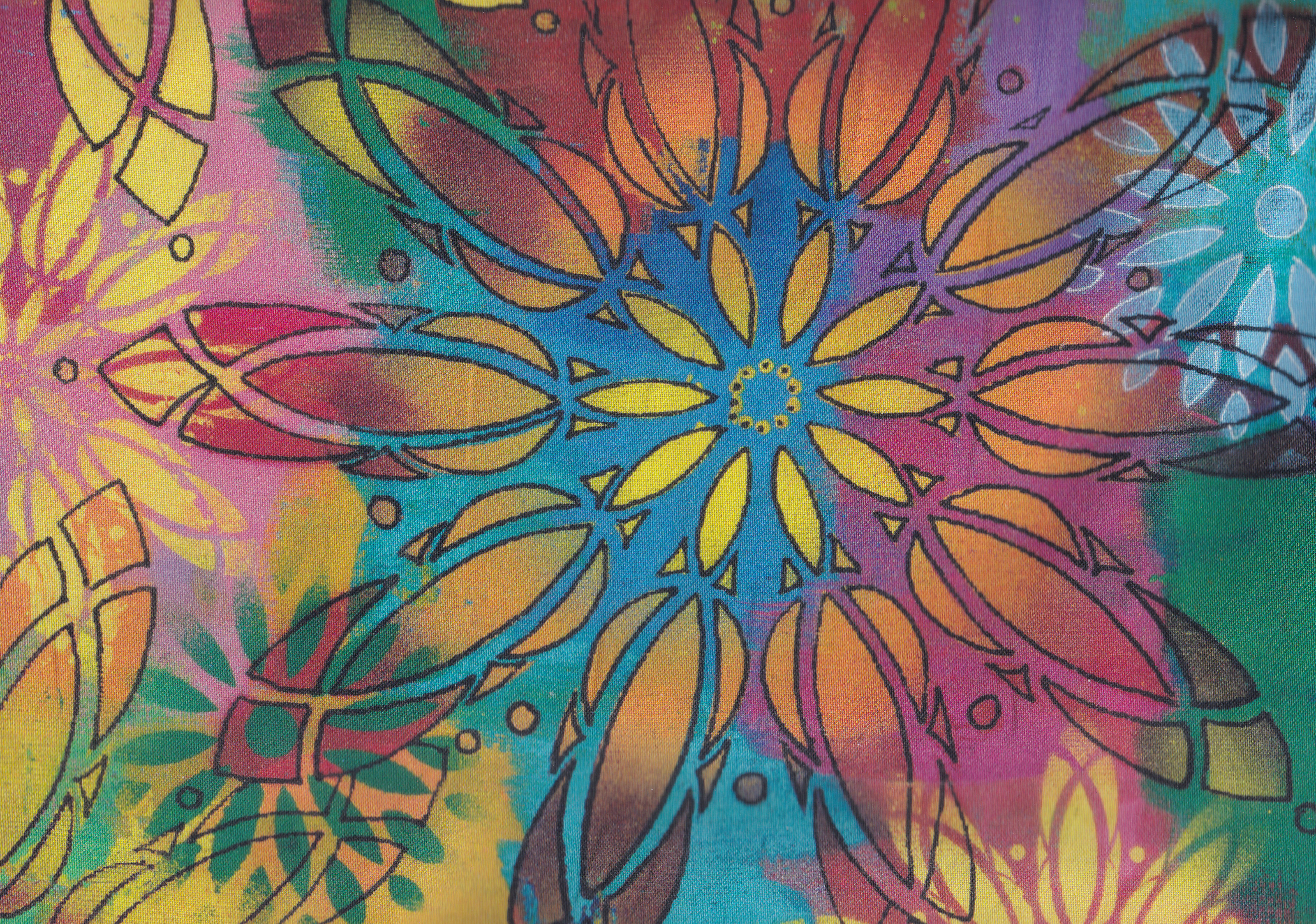 Patchworkstoff mit Blumen/ Mandals. Design Sue Penn. Motiv wiederhollt sich alle 60 cm, könnte auch für Wonderblock passen.