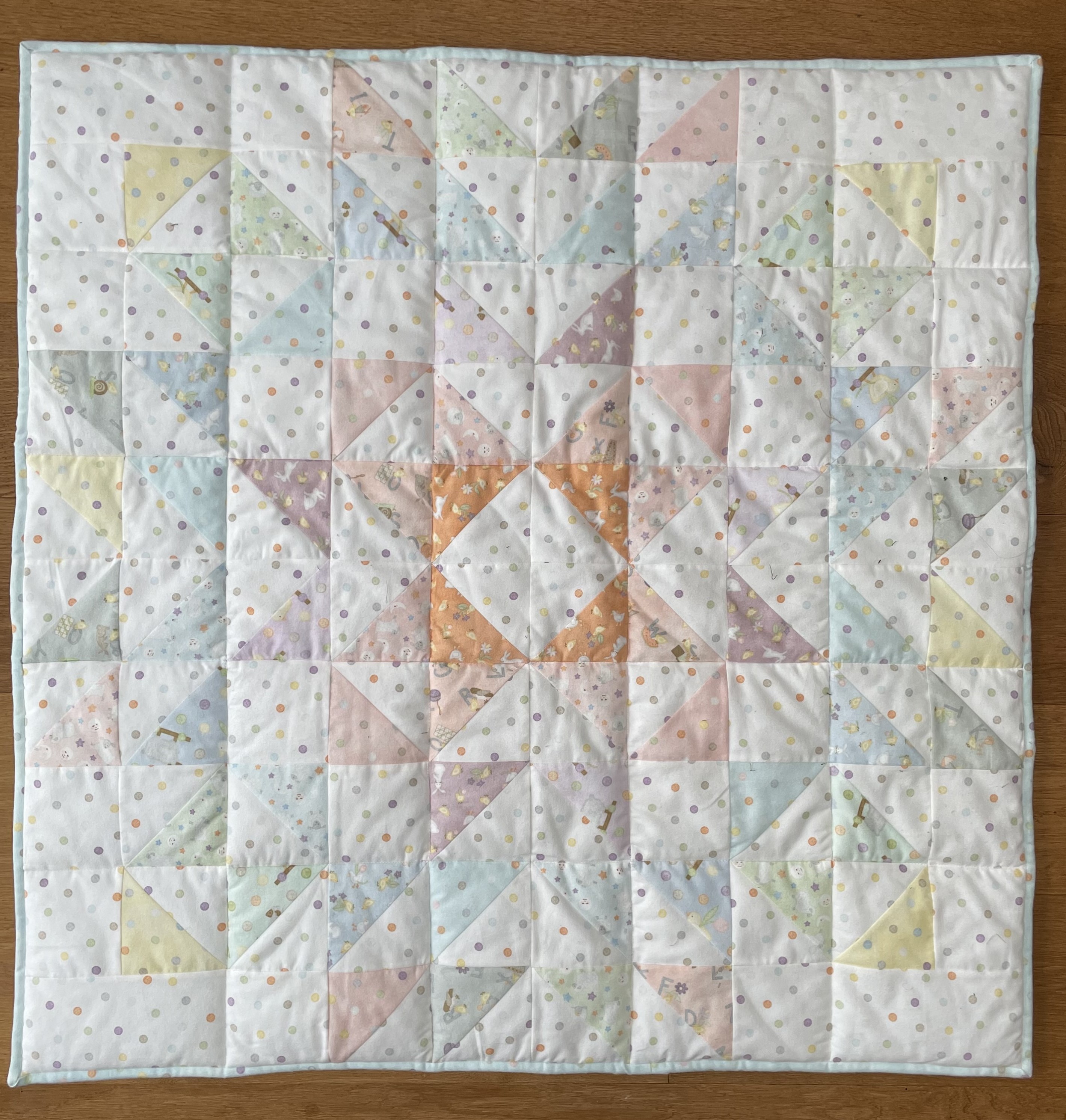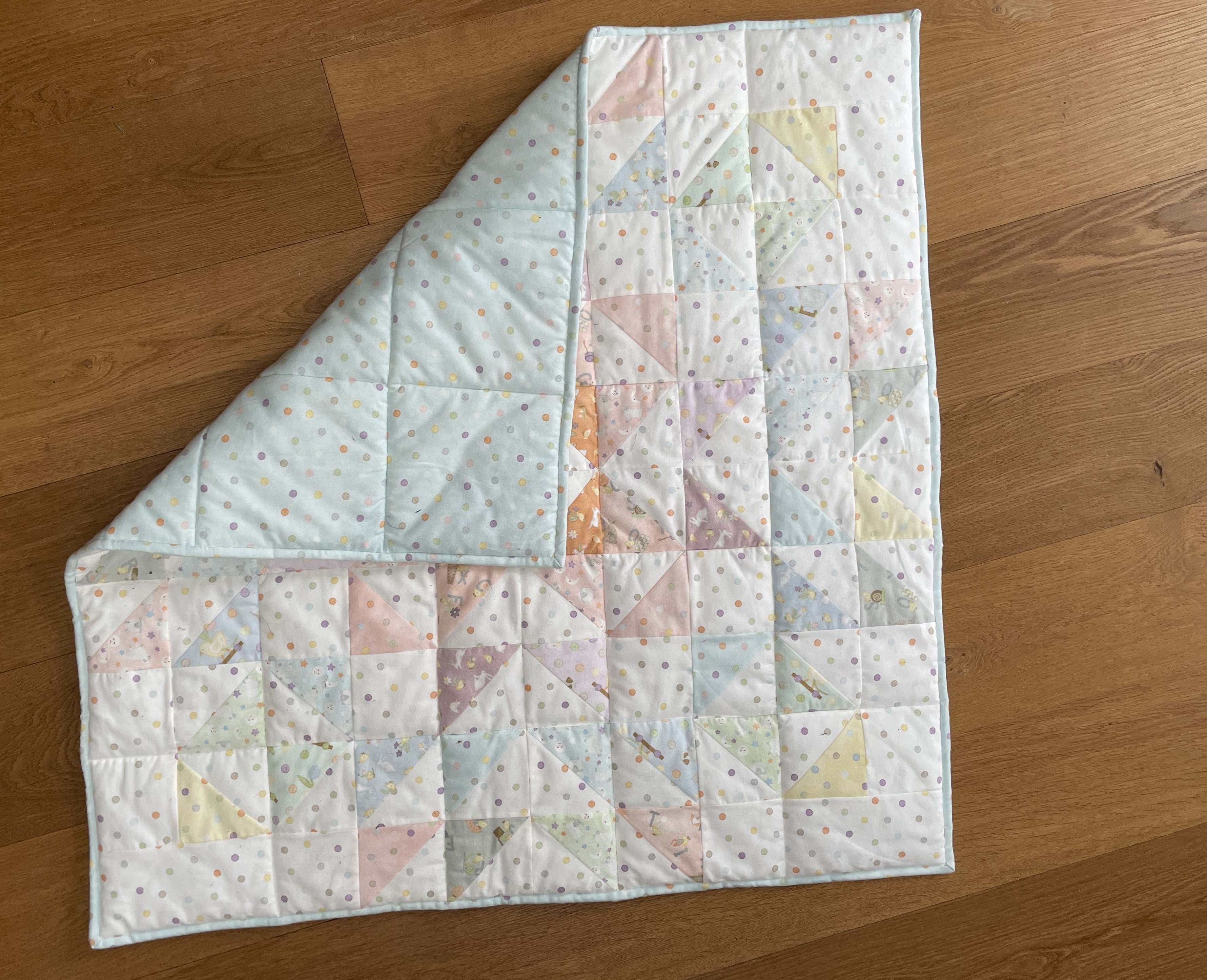 Stoffmenge für Babydecke 1 Päckchen Little Chicks, 1,10 Altweiß mit Punkten und für die Rückseite auch 1,10 x 1,10 m Blau mit Punkten. Technik: Schnelle Dreiecke.