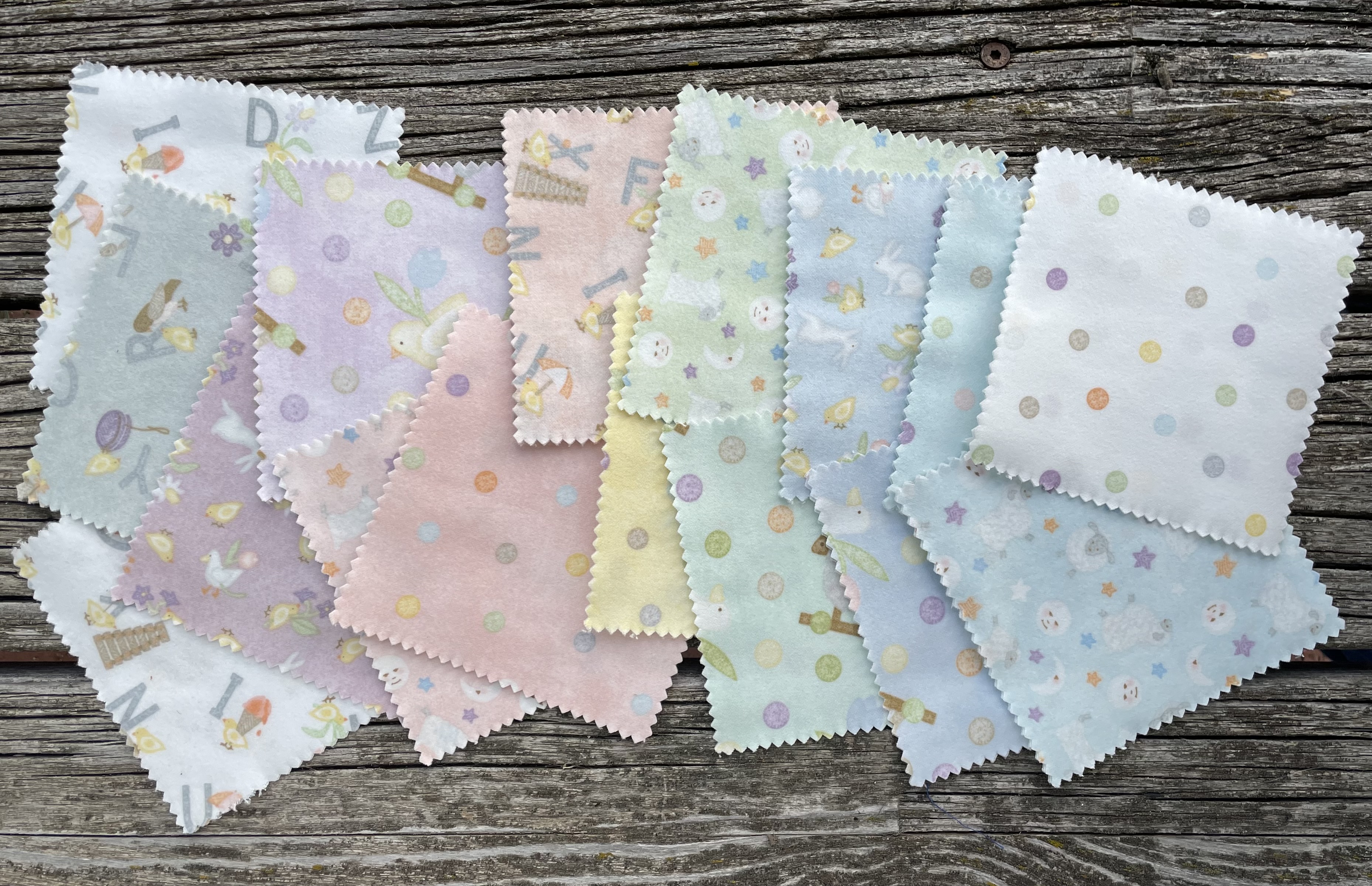 42 Quadrate in der Größe 5 inch ( ca.12,5 cm) sind in den pasteligen Farben aus Flanellstoffen von Maywood. Tolle, weiche, kuschelige Stoffquadrate. Toll für Babydecken.Werden die Quadrate zusammengenäht, entsteht eine kleine Babydecke.