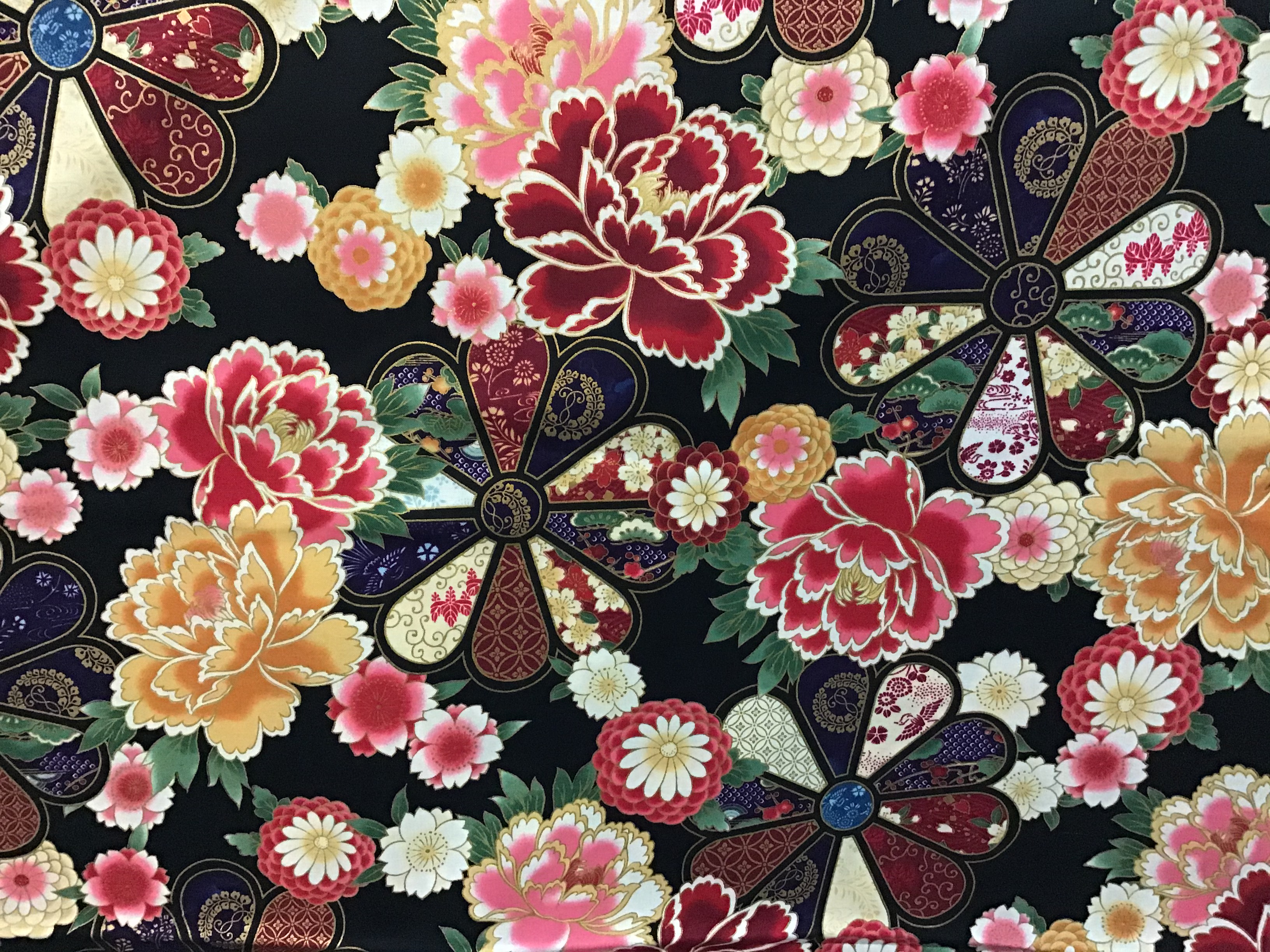 Patchworkstoff in Schwarz mit Blumenmuster und Golddruck.