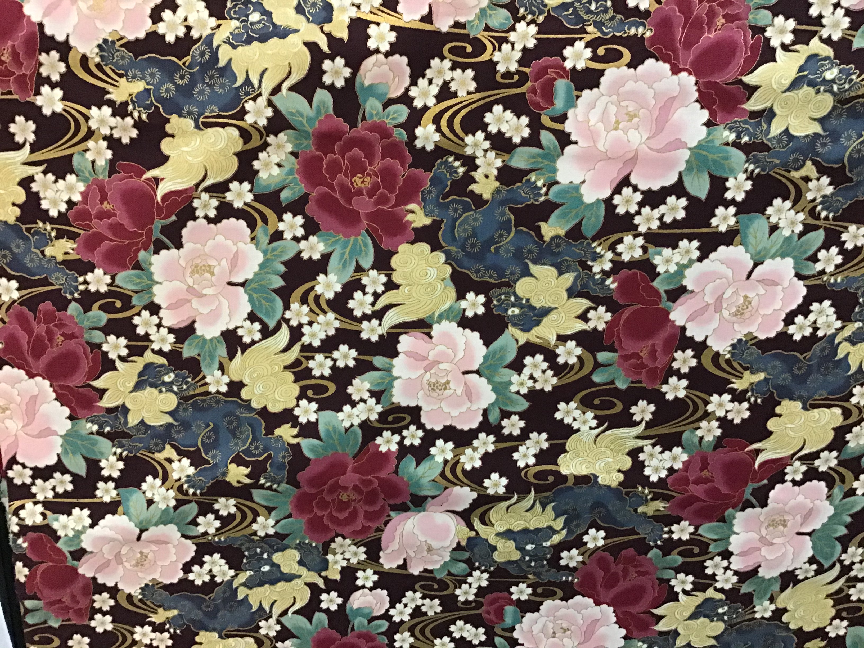 Patchworkstoff in Braun-Rot mit Blumenmuster und Golddruck.