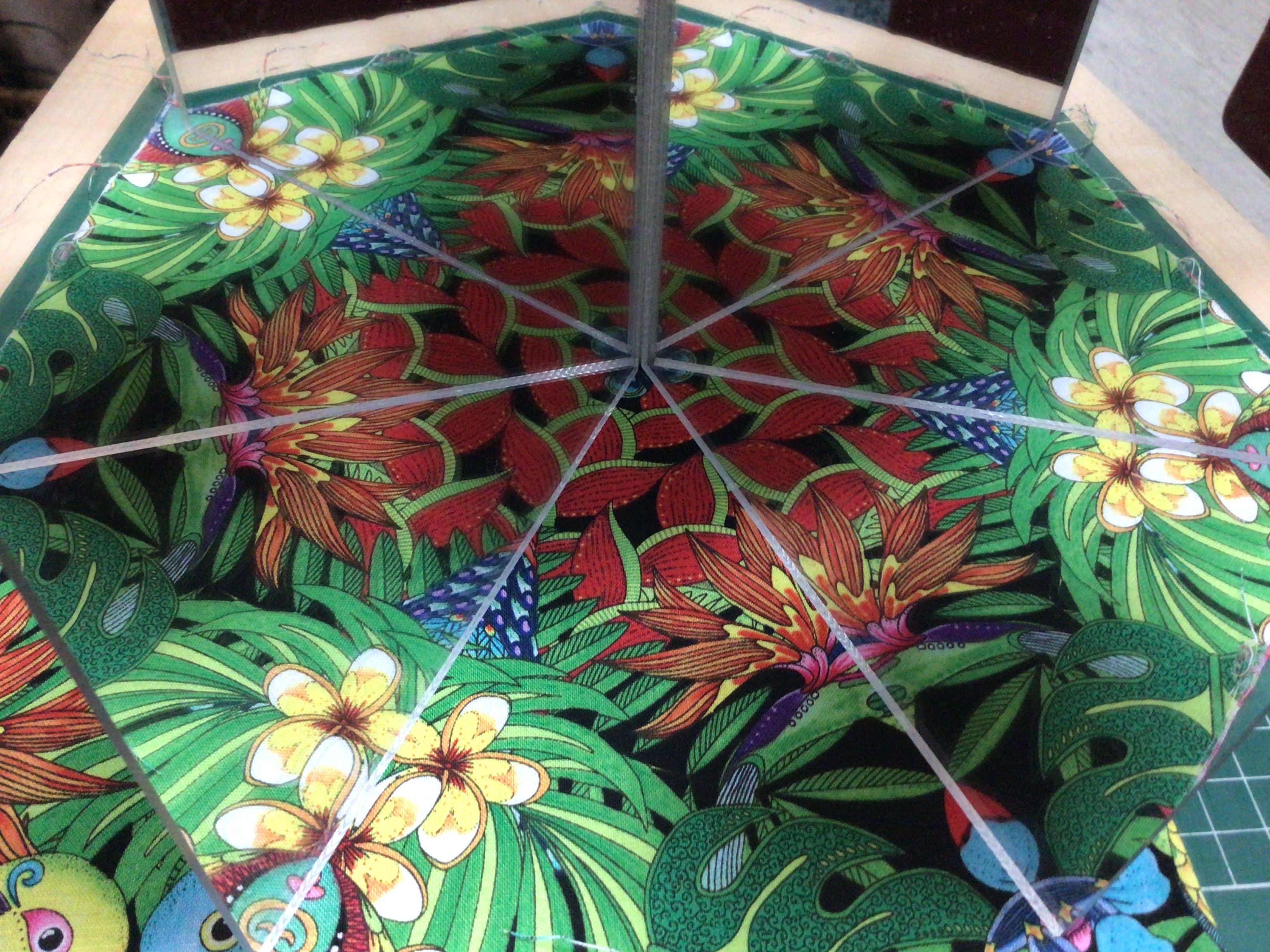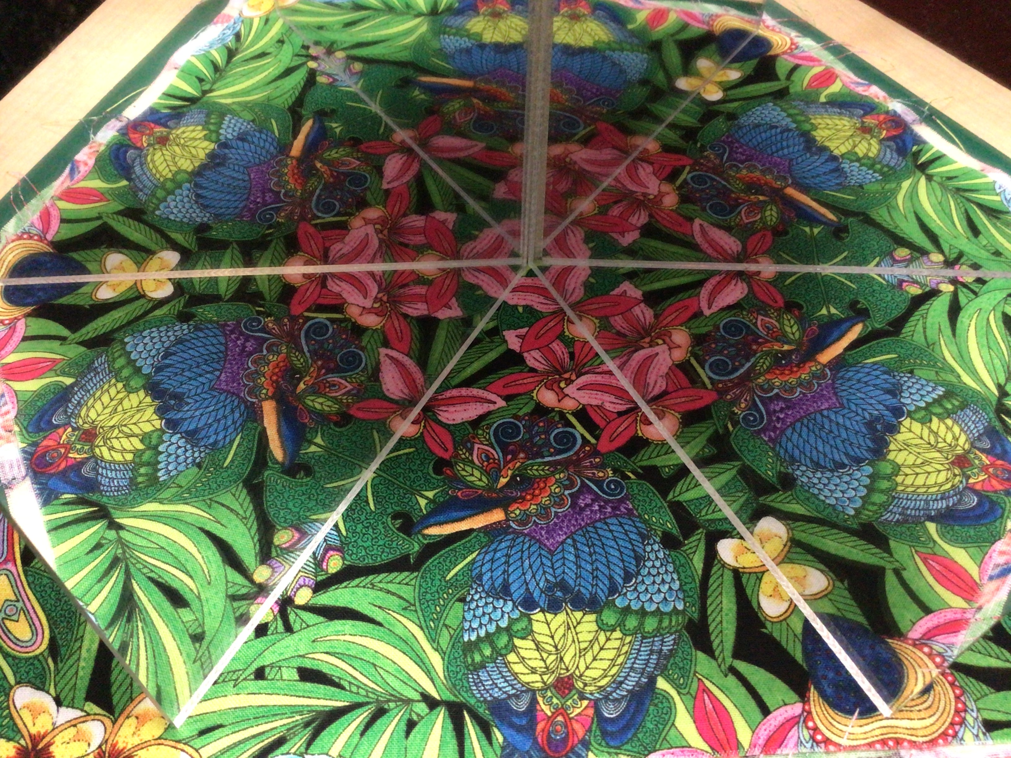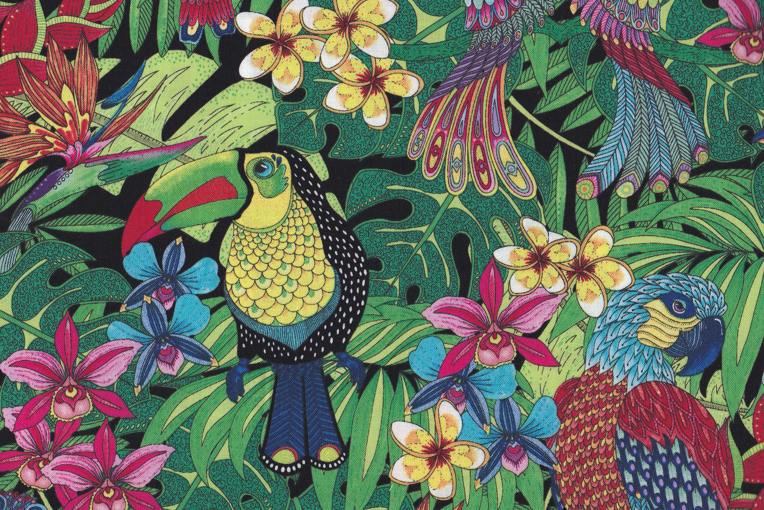 Patchworkstoff mit Blumen und Papagei. Papagei ca.hat die Größe von ca.13 cm hoch. Rapport wiederholt sich alle 32 cm. Auch gut geeignet für Wonderblocktechnik.