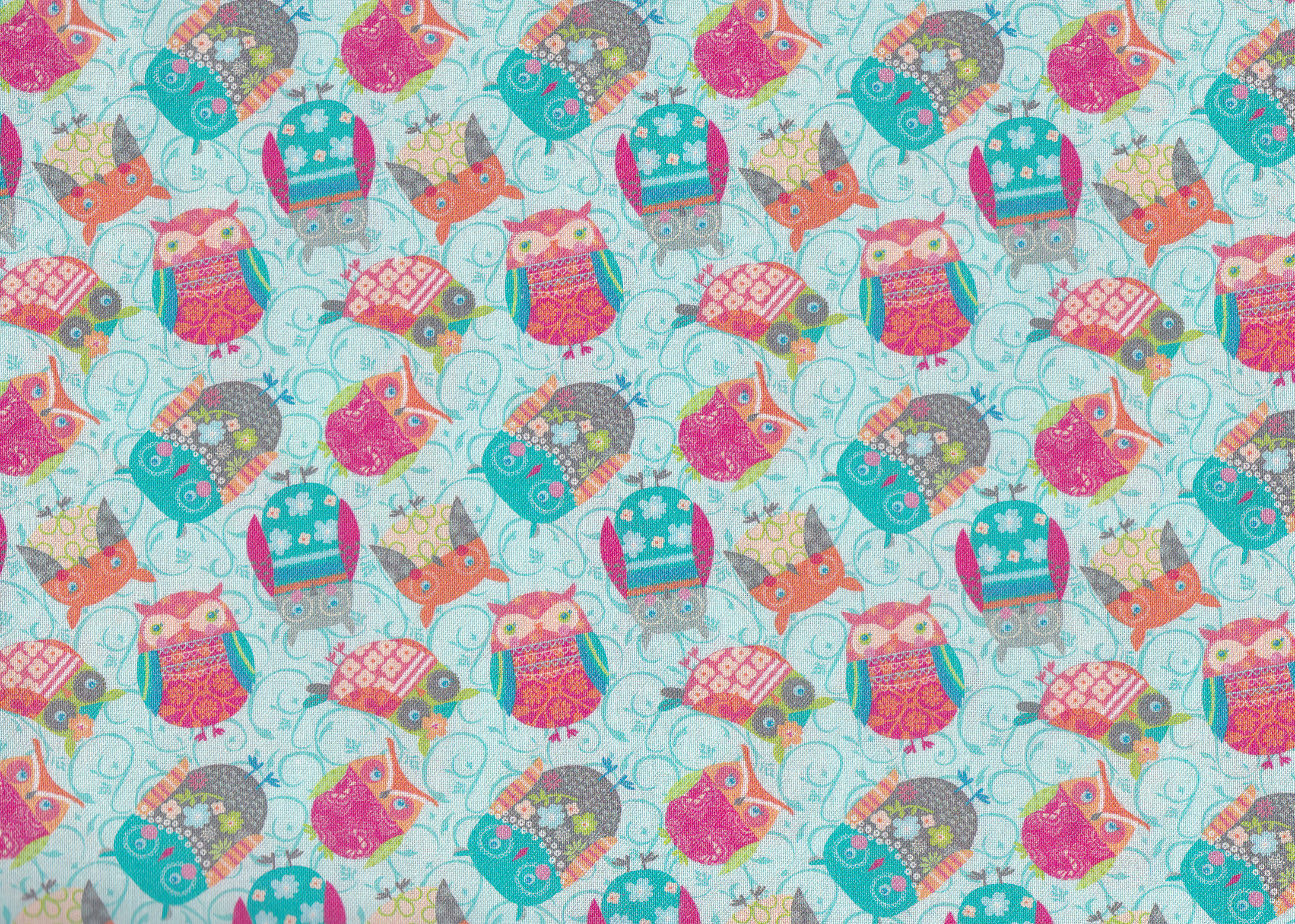 Patchworkstoff in Blau mit bunten, kleinen Eulen.
