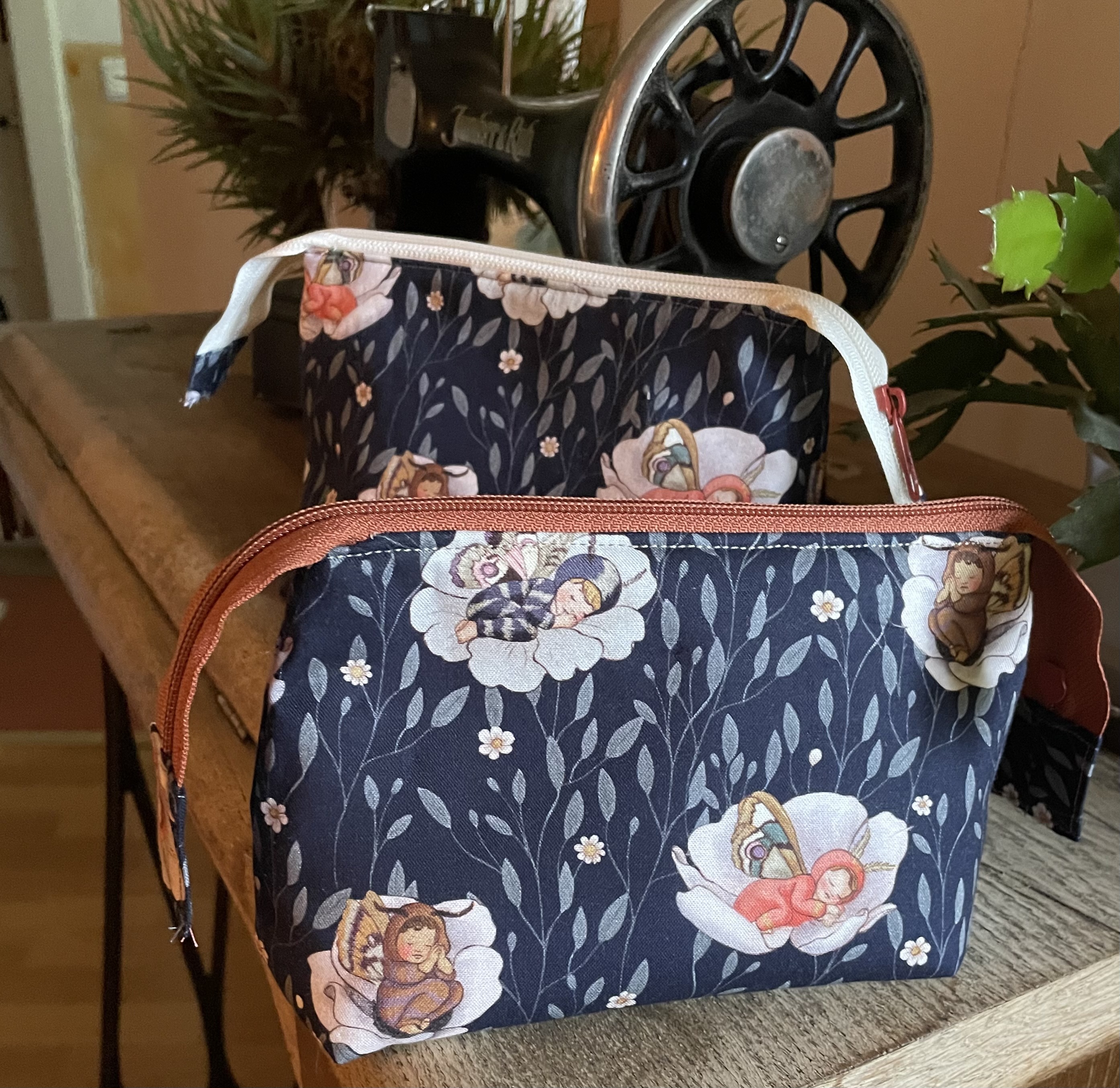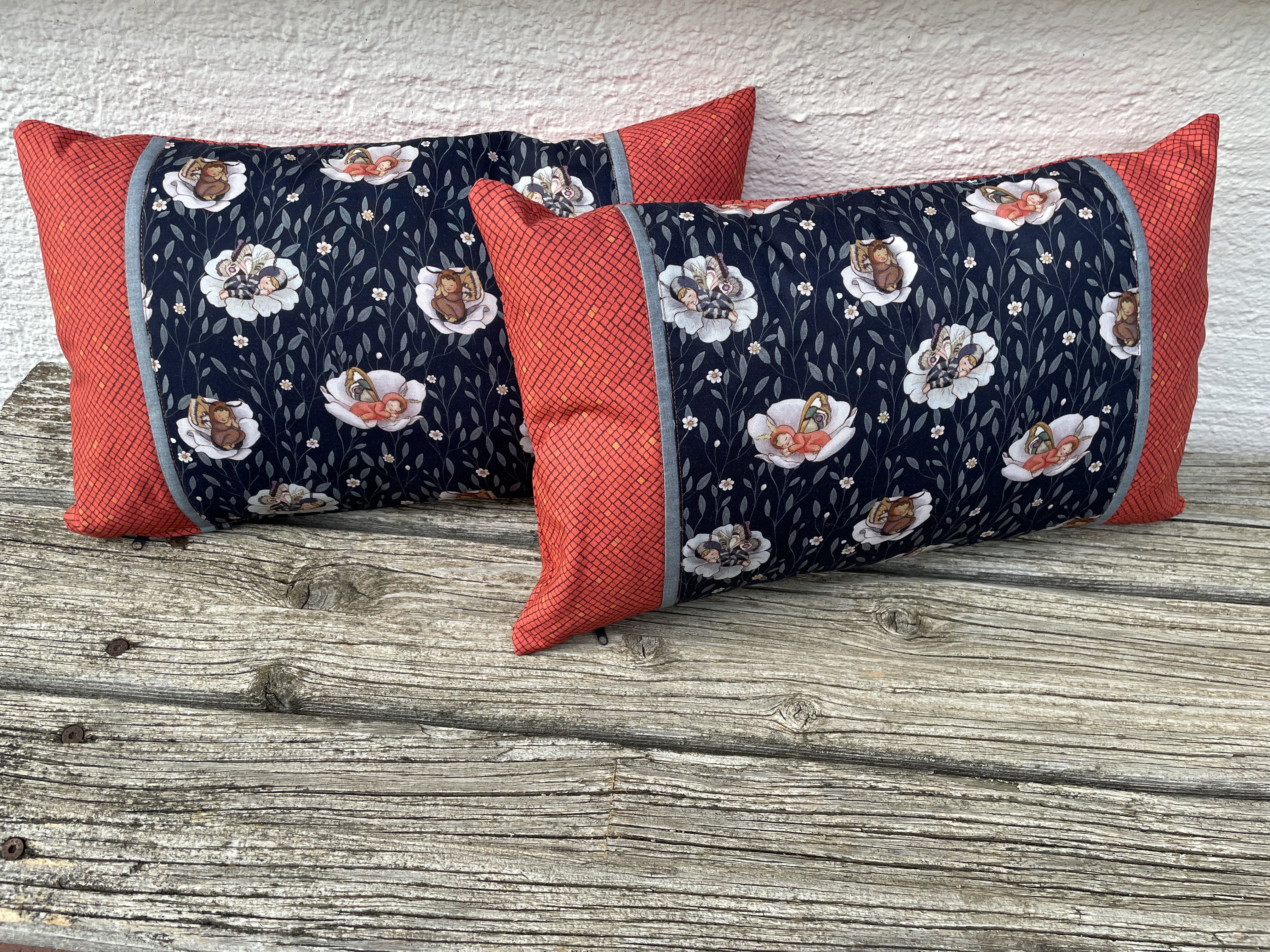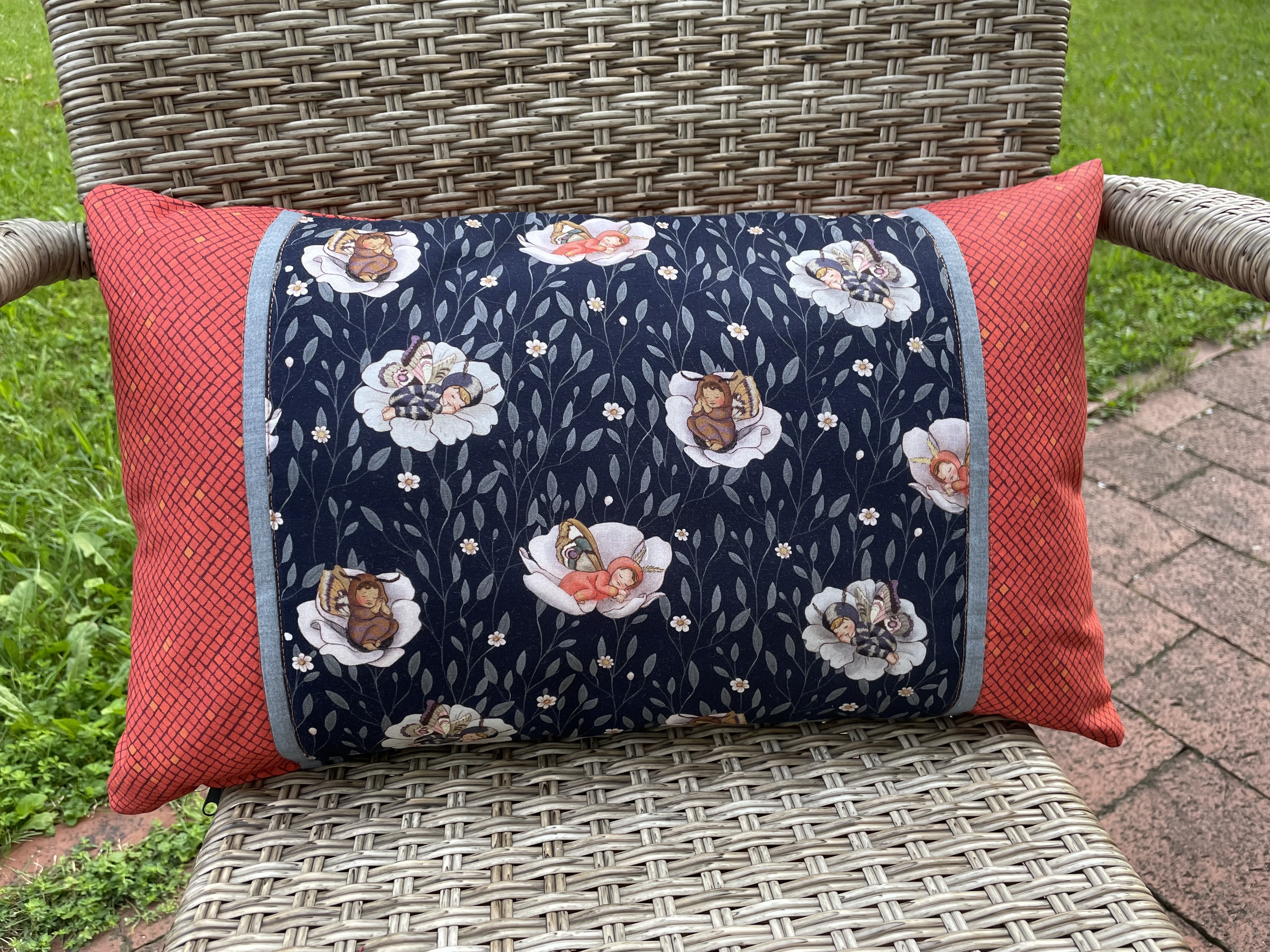 Patchworkstoff in Navy mit Schlaffenden Babys verkleidet als Motten/ Schmatterlingskinder. Motivgröße ca.5 x 5 cm und 5 x 6 cm.