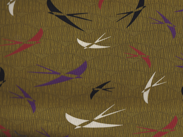Patchworkstoff in Olivegrün mit Vögeln in lila, cream, schwarz und terracotta.