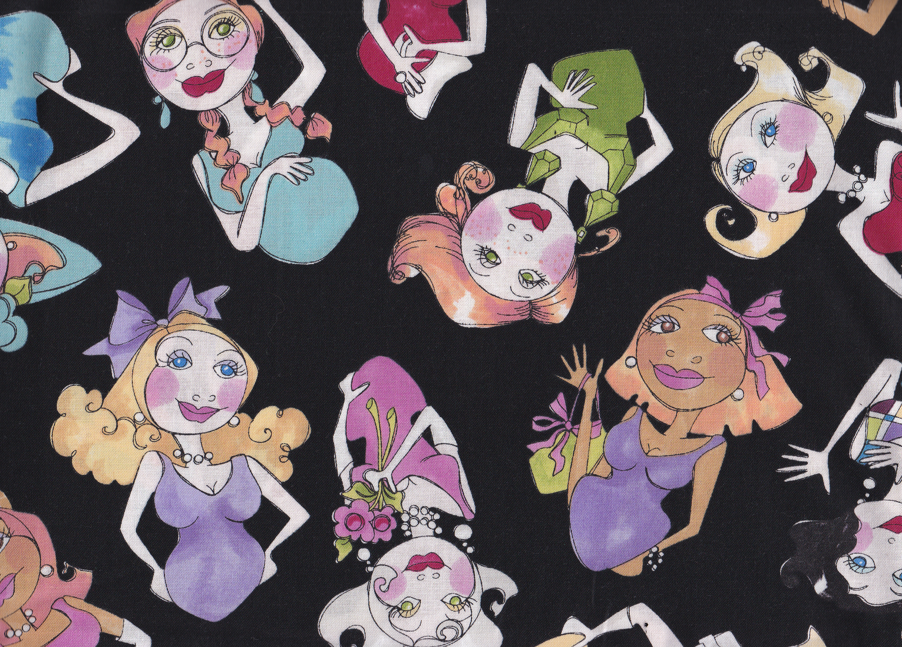 Patchworkstoff in Schwarz mit schicken Damen-Motiven. Motivgröße ca. 10/12 auf 5/6 cm.