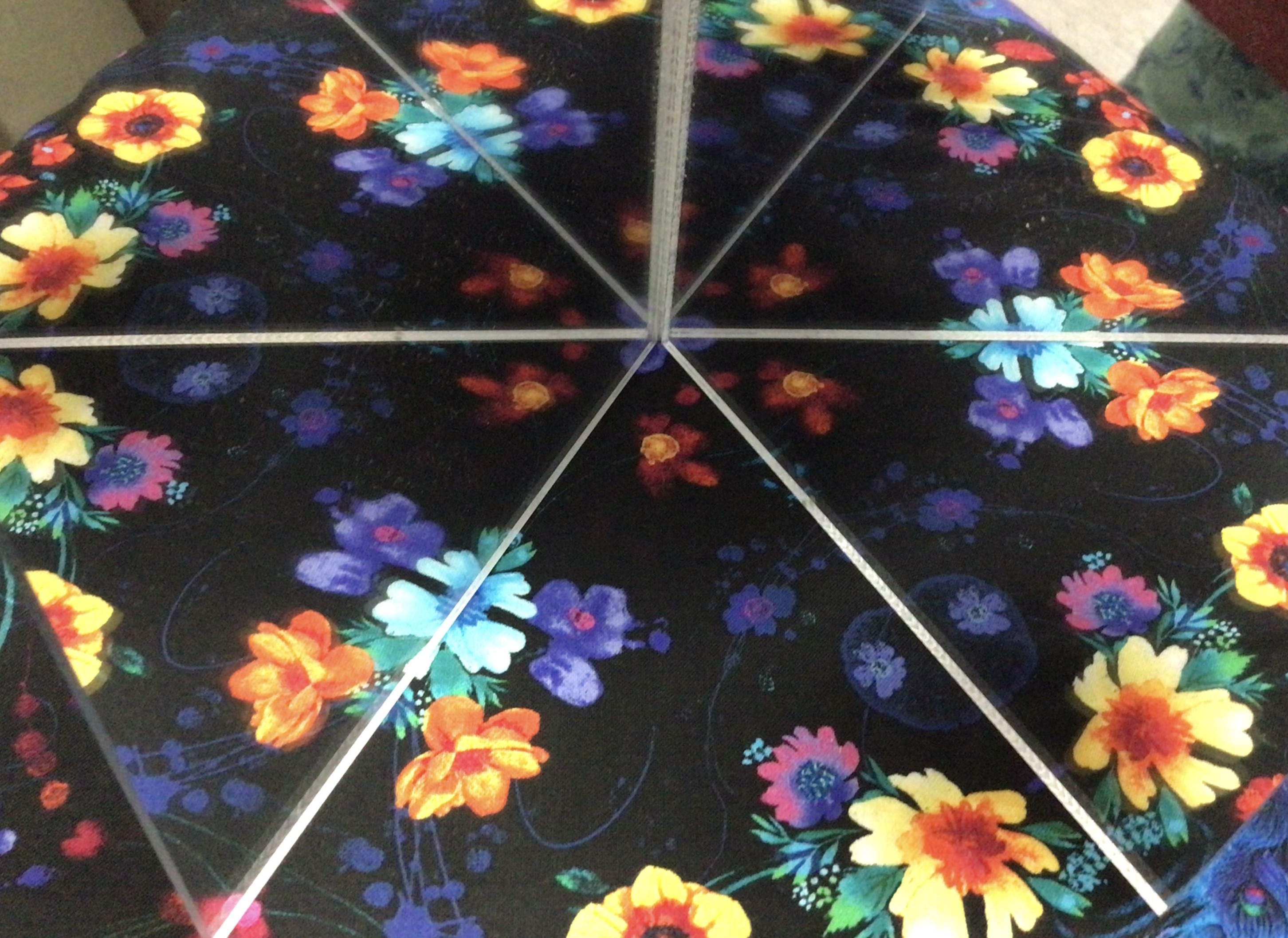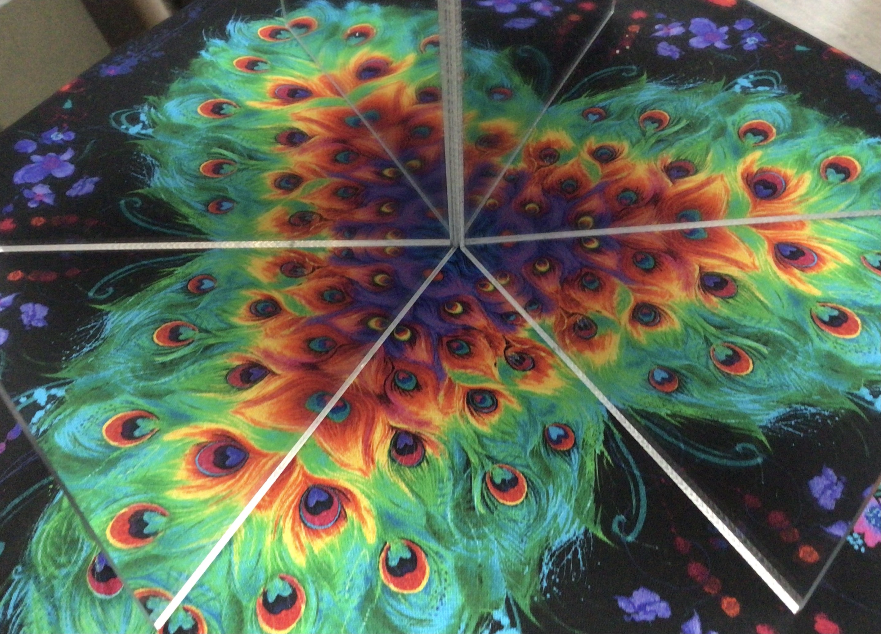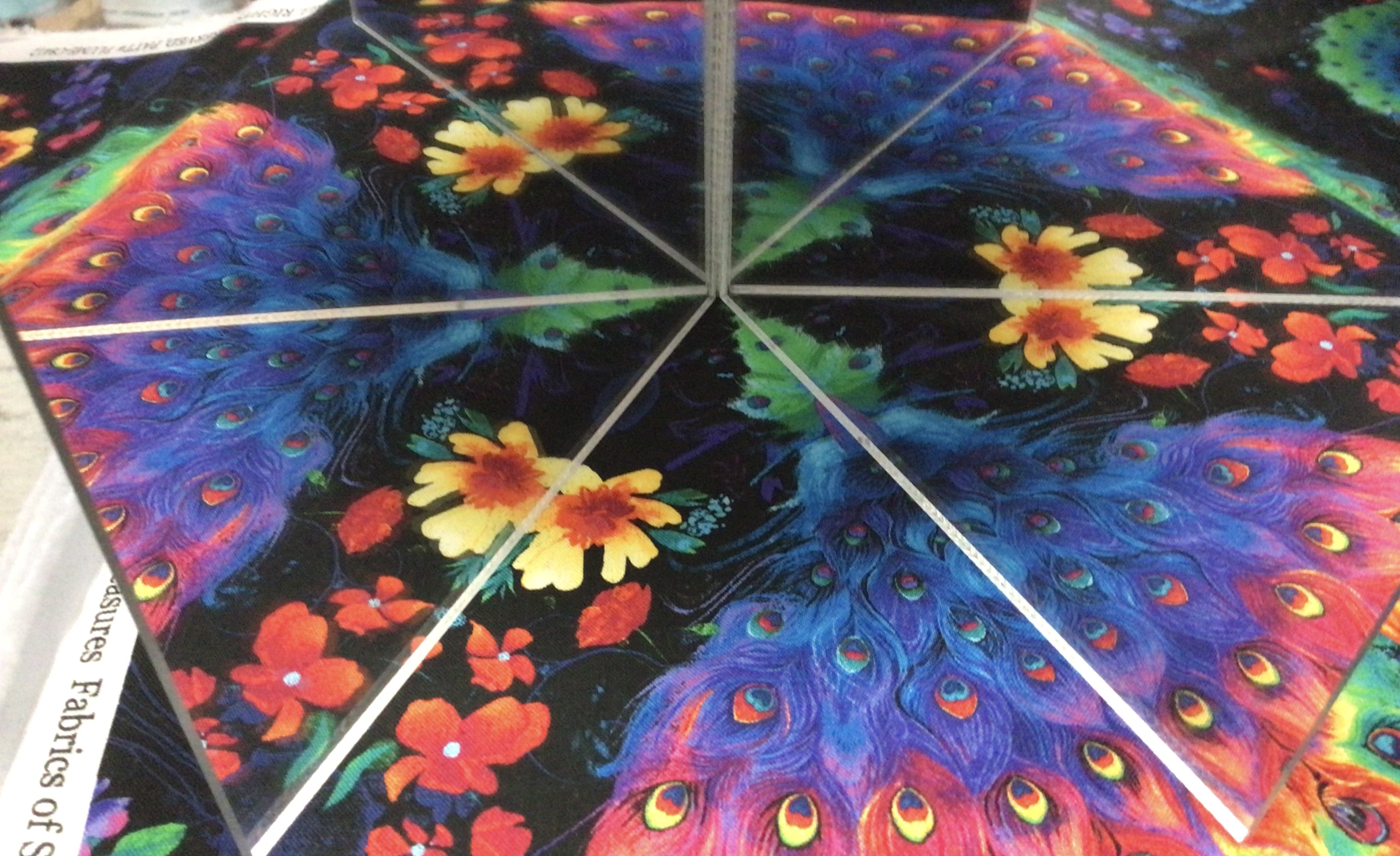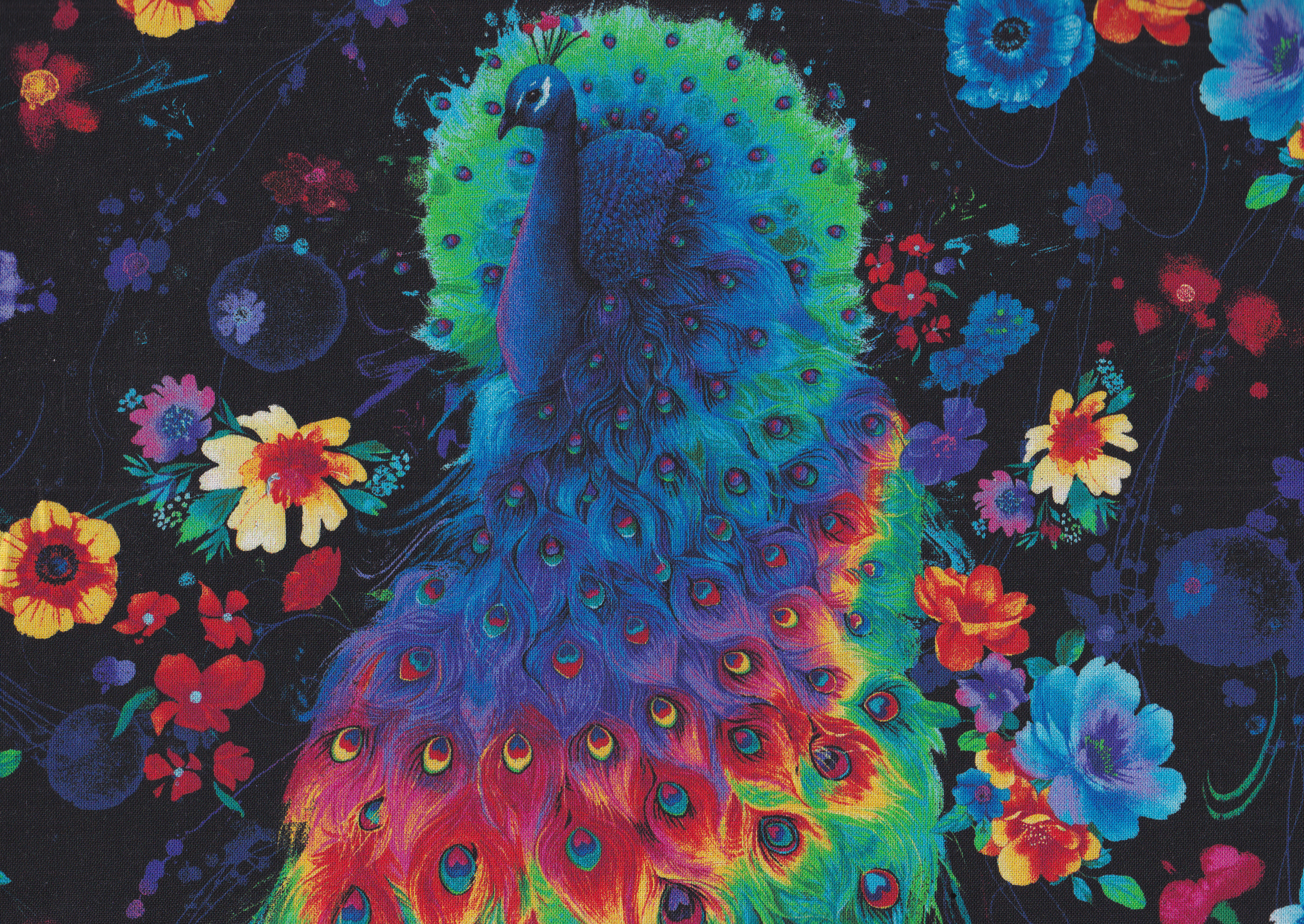 Patchworkstoff in Schwarz mit buntem Pfauen-Muster und Blumen.Wiederholung alle 30 cm. Kaleidoskop Tachnik Möglich zusammen mit Stoff C8413