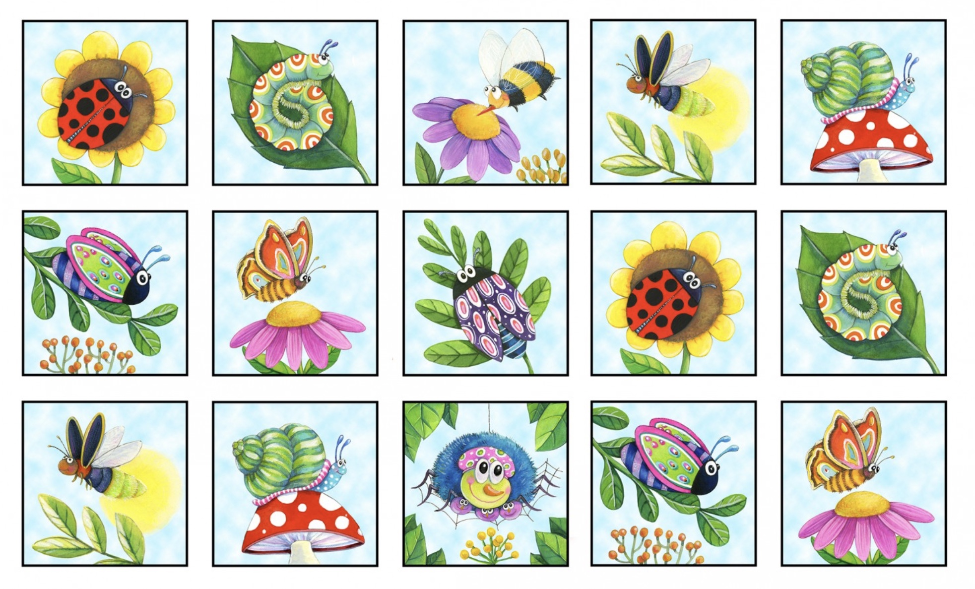 Patchworkstoff mit Insekten,Schnecken, Raupen. Panel für Kinderdecken, Krabbeldecken, Stoffbücher, Erste Bildermemory. 15 Bilder ca.18x 18 cm.