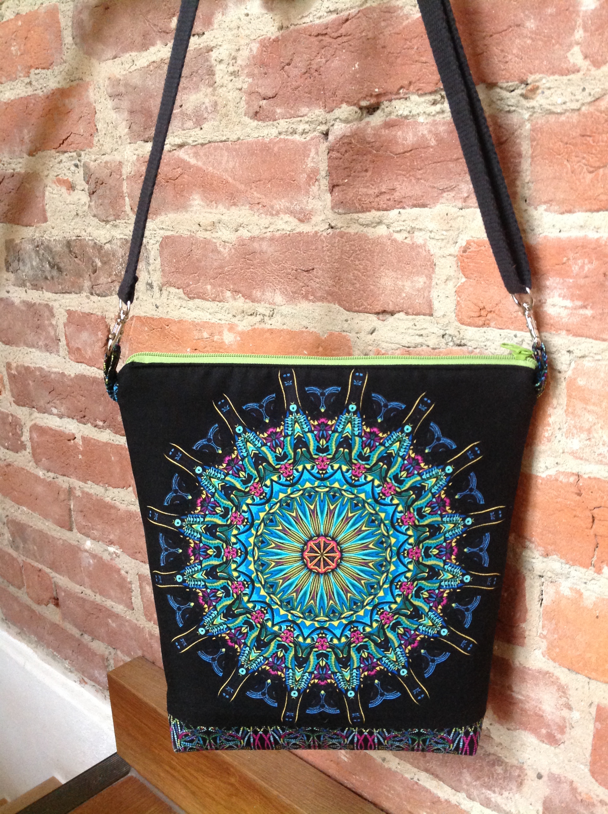 Patchworkstoff in Schwarz mit Lila-Pink-Gelben Mandalas mit einem Durchmesser von 25 cm.