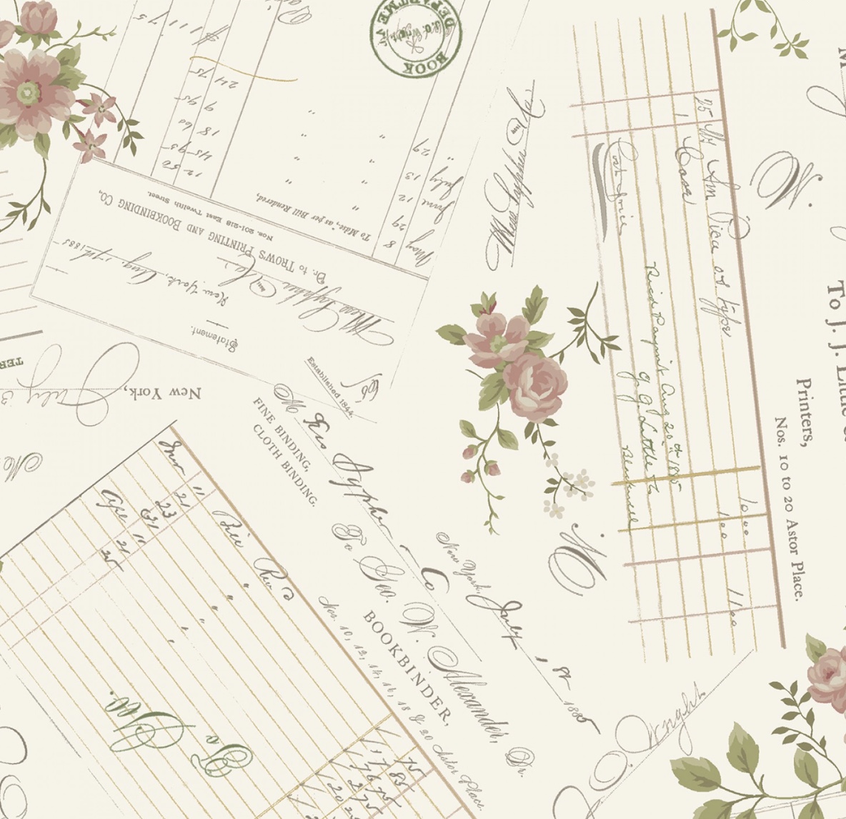 Patchworkstoff in Creme mit Schriften und Blumen. Stoff von Laura Berringer.