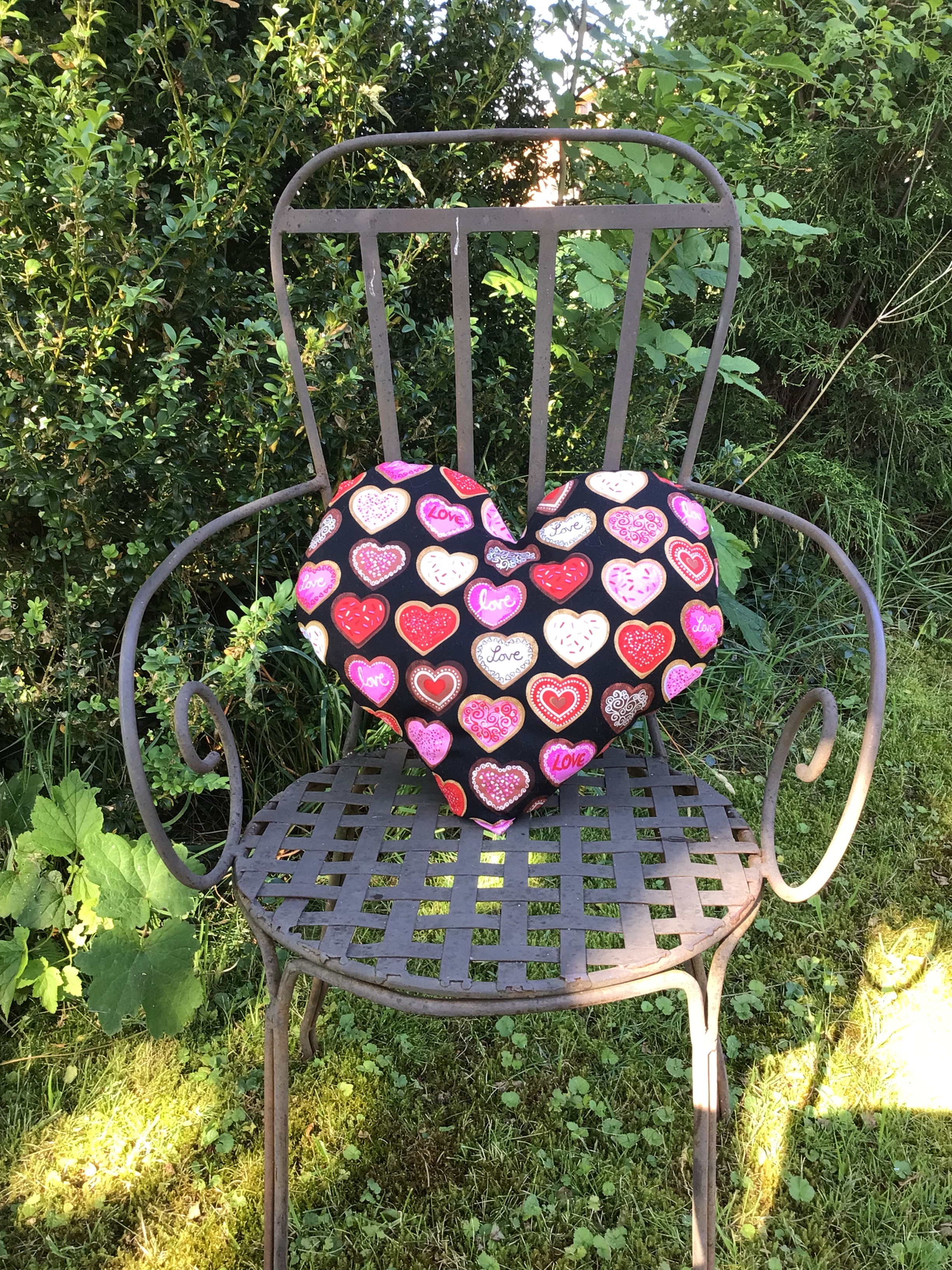 Patchworkstoff in Schwarz mit Herzen/ Lebkuchenherzen.