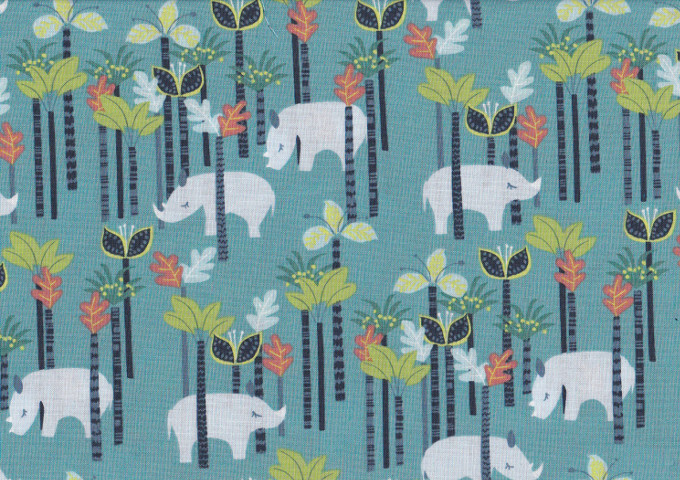 Patchworkstoff in Minz-Blau mit Nashorn-Motiven.