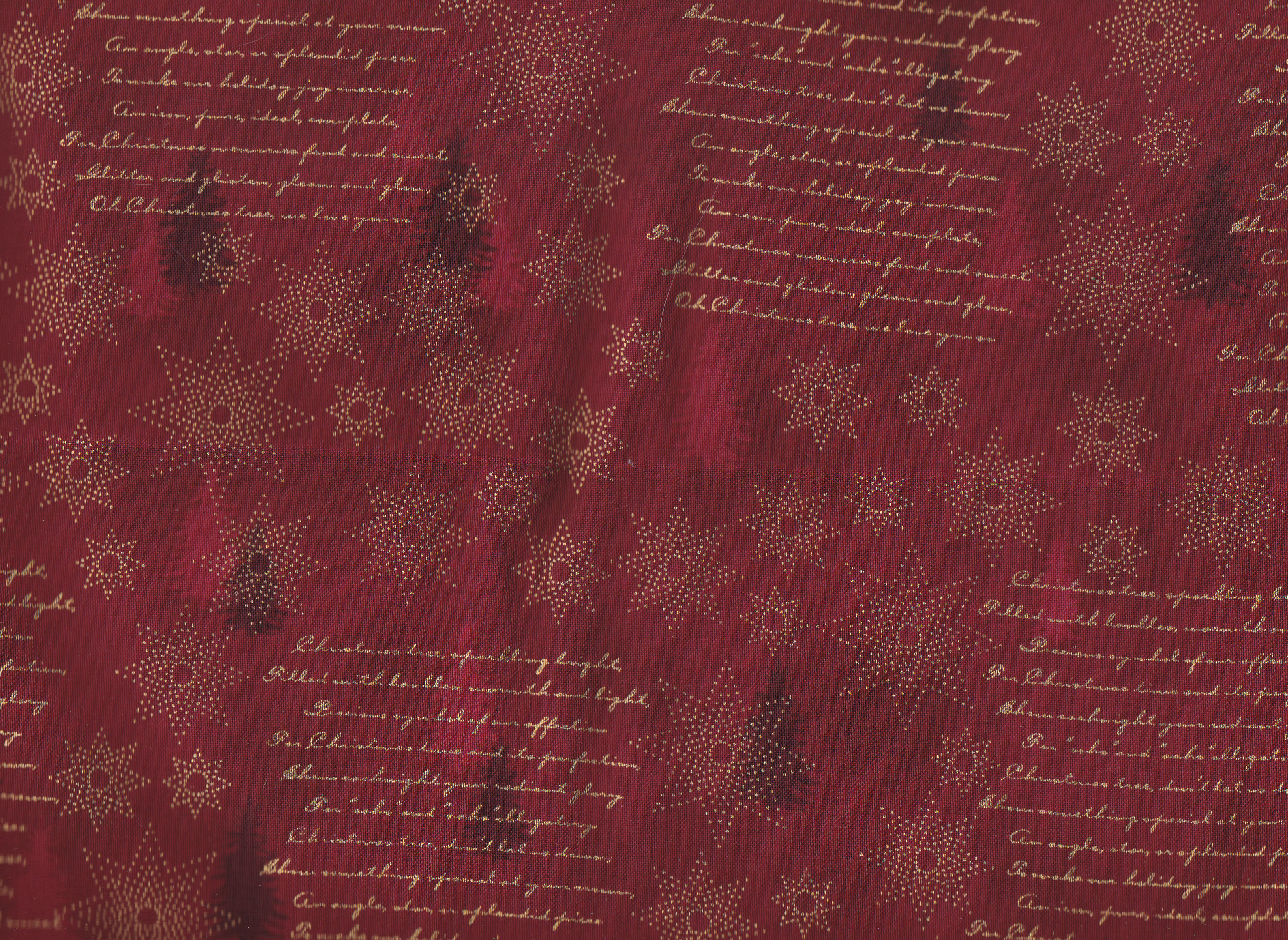 Patchworkstoff in Rot mit goldenen Sternen und Schriften.