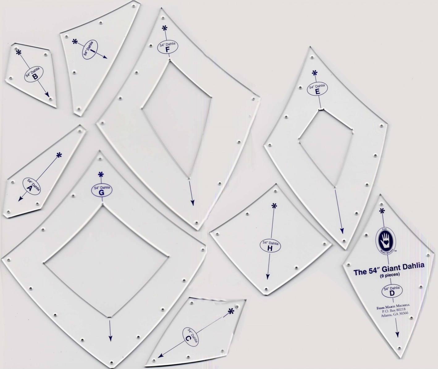 Acrylschablone für Giant Dahlia von Marti Michell. Schablonen Set mit 9 Teilen für 54" Große Blume.Dabei auch eine Nähanleitung und zusätzlich eine Nähanleitung für ein Quilt mit Dahlia in der Mitte in Größe 215 x 258 cm auf Englisch.
